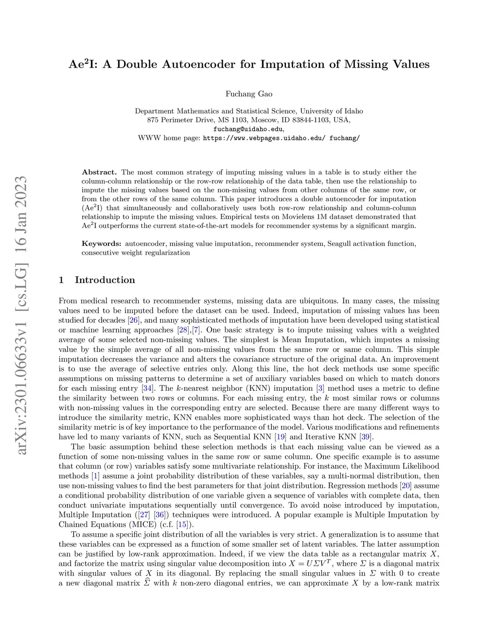 The most common strategy of imputing missing values in a table is to study either the column-column relationship or the row-row relationship of the data table, then use the relationship to impute the missing values based on the non-missing values from other columns of the same row, or from the other rows of the same column. This paper introduces a double autoencoder for imputation () that simultaneously and collaboratively uses both row-row relationship and column-column relationship to impute the missing values. Empirical tests on Movielens 1M dataset demonstrated that outperforms the current state-of-the-art models for recommender systems by a significant margin.
