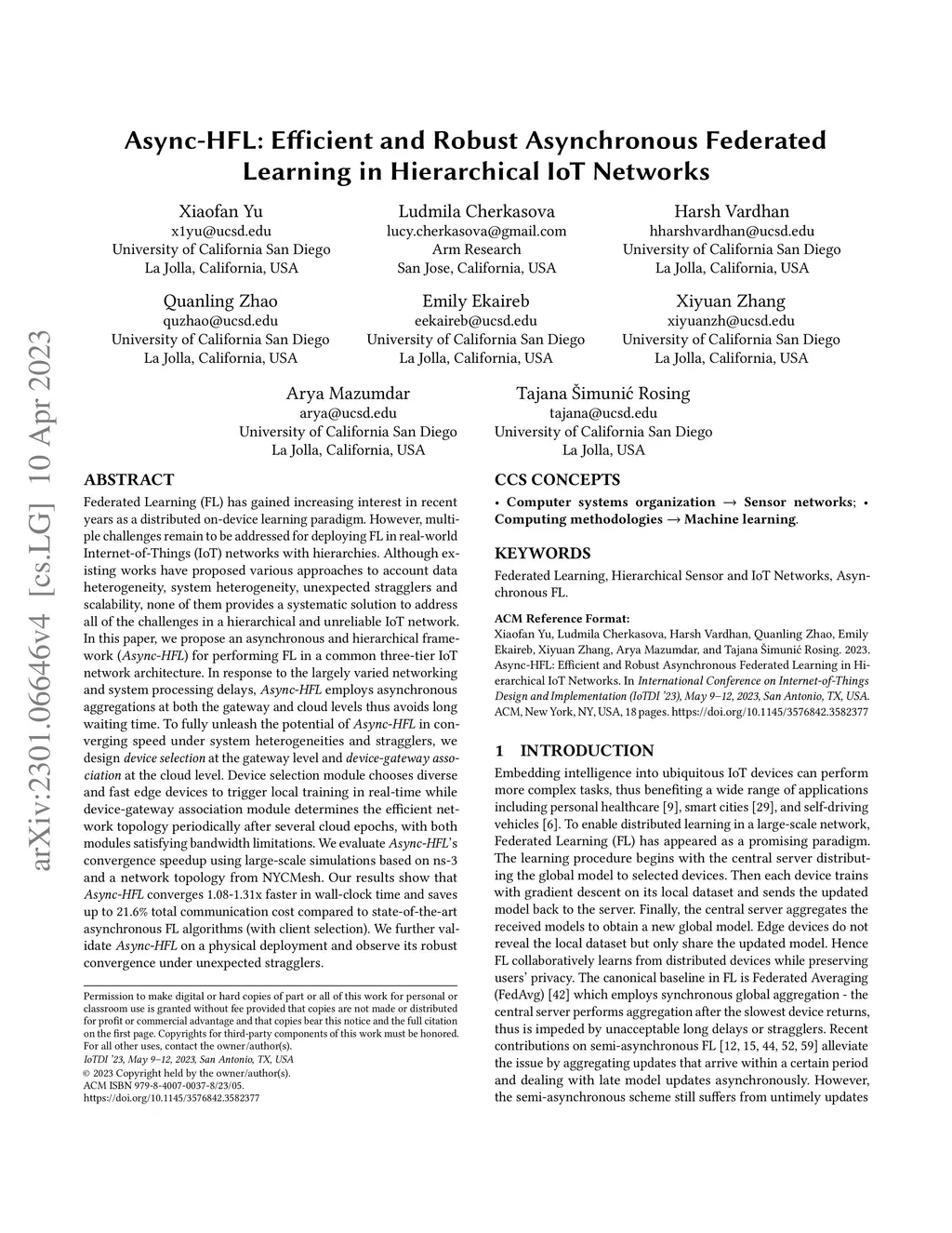 Federated Learning (FL) has gained increasing interest in recent years as a distributed on-device learning paradigm. However, multiple challenges remain to be addressed for deploying FL in real-world Internet-of-Things (IoT) networks with hierarchies. Although existing works have proposed various approaches to account data heterogeneity, system heterogeneity, unexpected stragglers and scalibility, none of them provides a systematic solution to address all of the challenges in a hierarchical and unreliable IoT network. In this paper, we propose an asynchronous and hierarchical framework (Async-HFL) for performing FL in a common three-tier IoT network architecture. In response to the largely varied delays, Async-HFL employs asynchronous aggregations at both the gateway and the cloud levels thus avoids long waiting time. To fully unleash the potential of Async-HFL in converging speed under system heterogeneities and stragglers, we design device selection at the gateway level and device-gateway association at the cloud level. Device selection chooses edge devices to trigger local training in real-time while device-gateway association determines the network topology periodically after several cloud epochs, both satisfying bandwidth limitation. We evaluate Async-HFL's convergence speedup using large-scale simulations based on ns-3 and a network topology from NYCMesh. Our results show that Async-HFL converges 1.08-1.31x faster in wall-clock time and saves up to 21.6% total communication cost compared to state-of-the-art asynchronous FL algorithms (with client selection). We further validate Async-HFL on a physical deployment and observe robust convergence under unexpected stragglers.