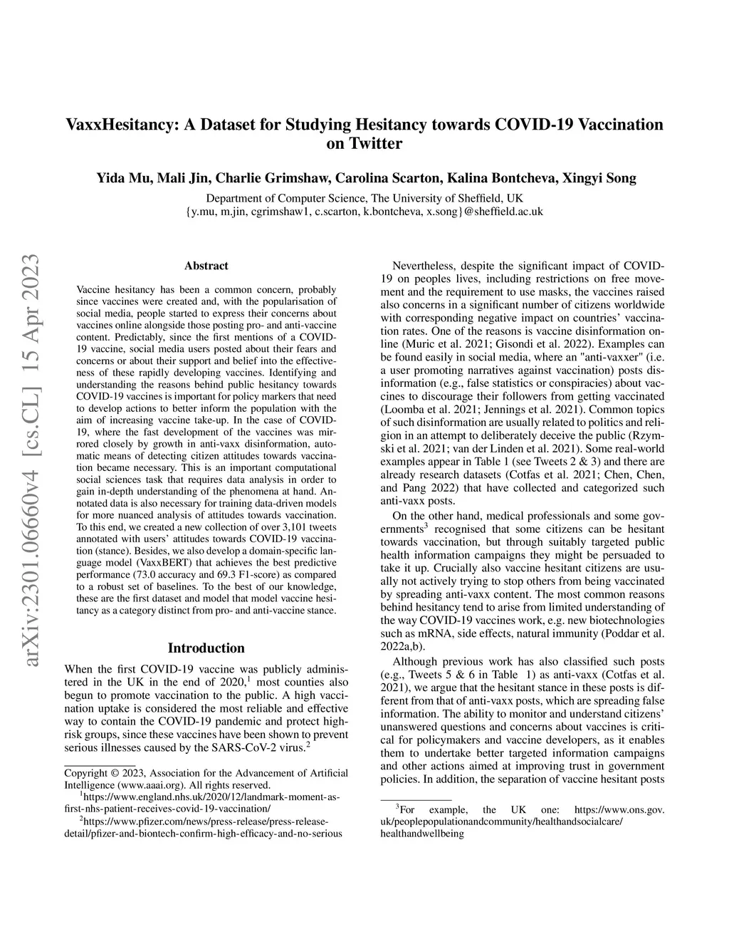 Vaccine hesitancy has been a common concern, probably since vaccines were created and, with the popularisation of social media, people started to express their concerns about vaccines online alongside those posting pro- and anti-vaccine content. Predictably, since the first mentions of a COVID-19 vaccine, social media users posted about their fears and concerns or about their support and belief into the effectiveness of these rapidly developing vaccines. Identifying and understanding the reasons behind public hesitancy towards COVID-19 vaccines is important for policy markers that need to develop actions to better inform the population with the aim of increasing vaccine take-up. In the case of COVID-19, where the fast development of the vaccines was mirrored closely by growth in anti-vaxx disinformation, automatic means of detecting citizen attitudes towards vaccination became necessary. This is an important computational social sciences task that requires data analysis in order to gain in-depth understanding of the phenomena at hand. Annotated data is also necessary for training data-driven models for more nuanced analysis of attitudes towards vaccination. To this end, we created a new collection of over 3,101 tweets annotated with users' attitudes towards COVID-19 vaccination (stance). Besides, we also develop a domain-specific language model (VaxxBERT) that achieves the best predictive performance (73.0 accuracy and 69.3 F1-score) as compared to a robust set of baselines. To the best of our knowledge, these are the first dataset and model that model vaccine hesitancy as a category distinct from pro- and anti-vaccine stance.