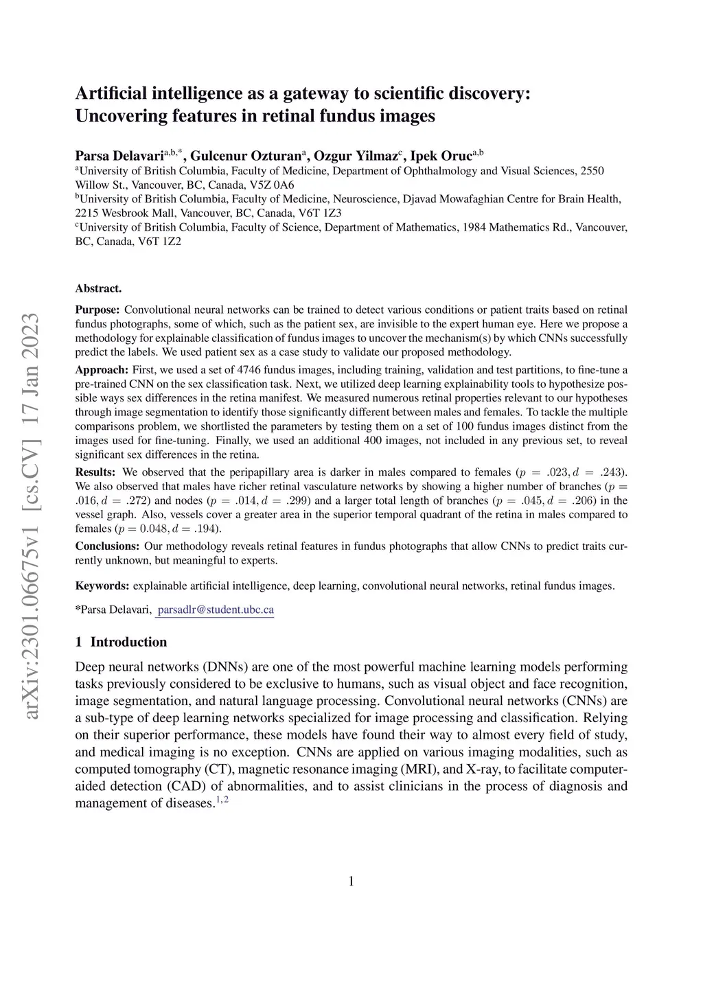 Purpose: Convolutional neural networks can be trained to detect various conditions or patient traits based on retinal fundus photographs, some of which, such as the patient sex, are invisible to the expert human eye. Here we propose a methodology for explainable classification of fundus images to uncover the mechanism(s) by which CNNs successfully predict the labels. We used patient sex as a case study to validate our proposed methodology. Approach: First, we used a set of 4746 fundus images, including training, validation and test partitions, to fine-tune a pre-trained CNN on the sex classification task. Next, we utilized deep learning explainability tools to hypothesize possible ways sex differences in the retina manifest. We measured numerous retinal properties relevant to our hypotheses through image segmentation to identify those significantly different between males and females. To tackle the multiple comparisons problem, we shortlisted the parameters by testing them on a set of 100 fundus images distinct from the images used for fine-tuning. Finally, we used an additional 400 images, not included in any previous set, to reveal significant sex differences in the retina. Results: We observed that the peripapillary area is darker in males compared to females (). We also observed that males have richer retinal vasculature networks by showing a higher number of branches () and nodes () and a larger total length of branches () in the vessel graph. Also, vessels cover a greater area in the superior temporal quadrant of the retina in males compared to females (). Conclusions: Our methodology reveals retinal features in fundus photographs that allow CNNs to predict traits currently unknown, but meaningful to experts.