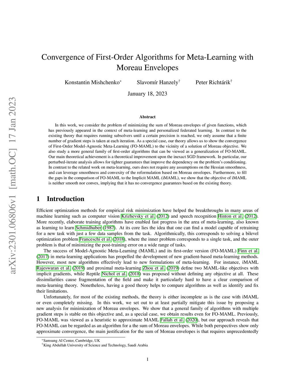 In this work, we consider the problem of minimizing the sum of Moreau envelopes of given functions, which has previously appeared in the context of meta-learning and personalized federated learning. In contrast to the existing theory that requires running subsolvers until a certain precision is reached, we only assume that a finite number of gradient steps is taken at each iteration. As a special case, our theory allows us to show the convergence of First-Order Model-Agnostic Meta-Learning (FO-MAML) to the vicinity of a solution of Moreau objective. We also study a more general family of first-order algorithms that can be viewed as a generalization of FO-MAML. Our main theoretical achievement is a theoretical improvement upon the inexact SGD framework. In particular, our perturbed-iterate analysis allows for tighter guarantees that improve the dependency on the problem's conditioning. In contrast to the related work on meta-learning, ours does not require any assumptions on the Hessian smoothness, and can leverage smoothness and convexity of the reformulation based on Moreau envelopes. Furthermore, to fill the gaps in the comparison of FO-MAML to the Implicit MAML (iMAML), we show that the objective of iMAML is neither smooth nor convex, implying that it has no convergence guarantees based on the existing theory.