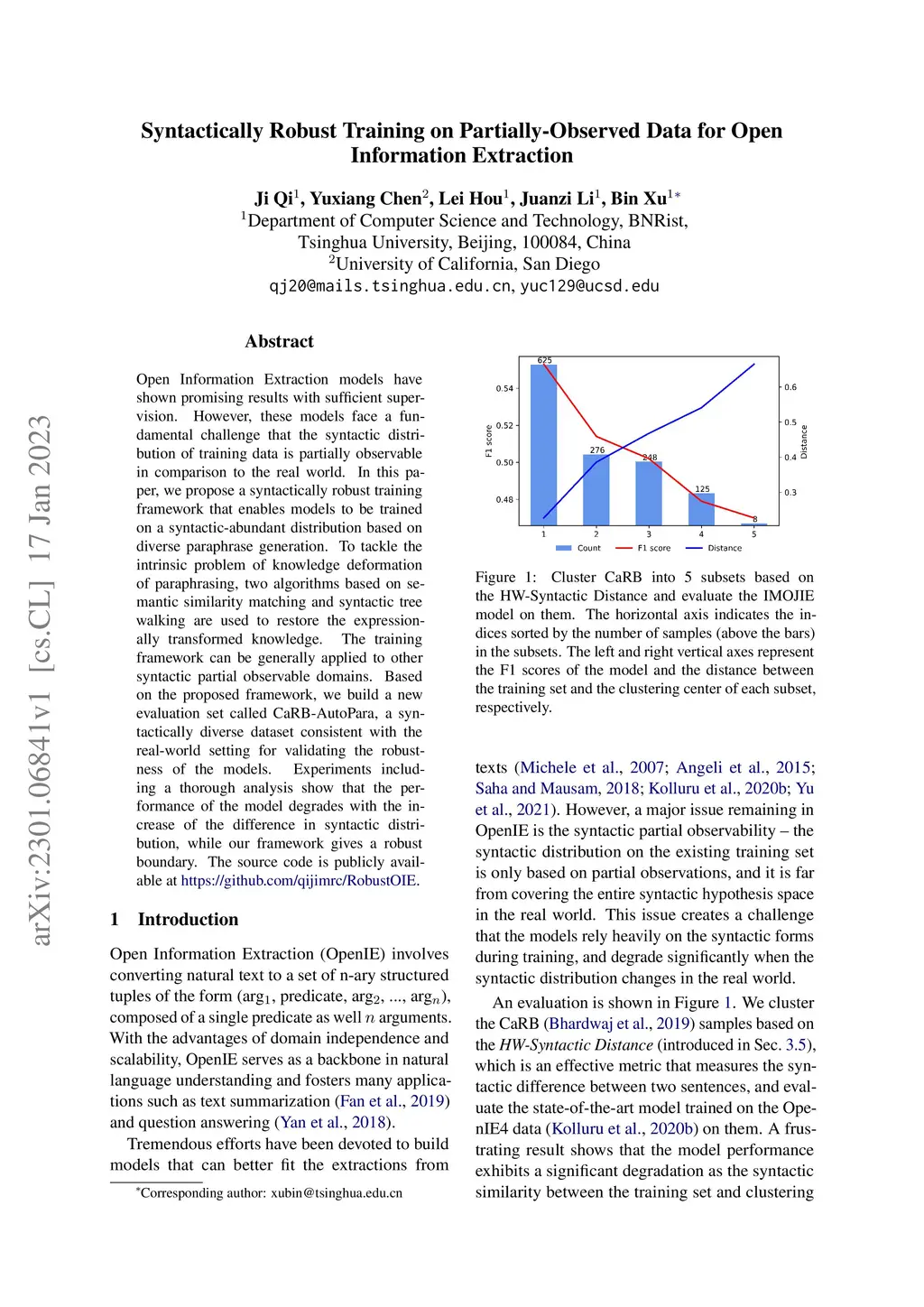 Open Information Extraction models have shown promising results with sufficient supervision. However, these models face a fundamental challenge that the syntactic distribution of training data is partially observable in comparison to the real world. In this paper, we propose a syntactically robust training framework that enables models to be trained on a syntactic-abundant distribution based on diverse paraphrase generation. To tackle the intrinsic problem of knowledge deformation of paraphrasing, two algorithms based on semantic similarity matching and syntactic tree walking are used to restore the expressionally transformed knowledge. The training framework can be generally applied to other syntactic partial observable domains. Based on the proposed framework, we build a new evaluation set called CaRB-AutoPara, a syntactically diverse dataset consistent with the real-world setting for validating the robustness of the models. Experiments including a thorough analysis show that the performance of the model degrades with the increase of the difference in syntactic distribution, while our framework gives a robust boundary. The source code is publicly available at https://github.com/qijimrc/RobustOIE.