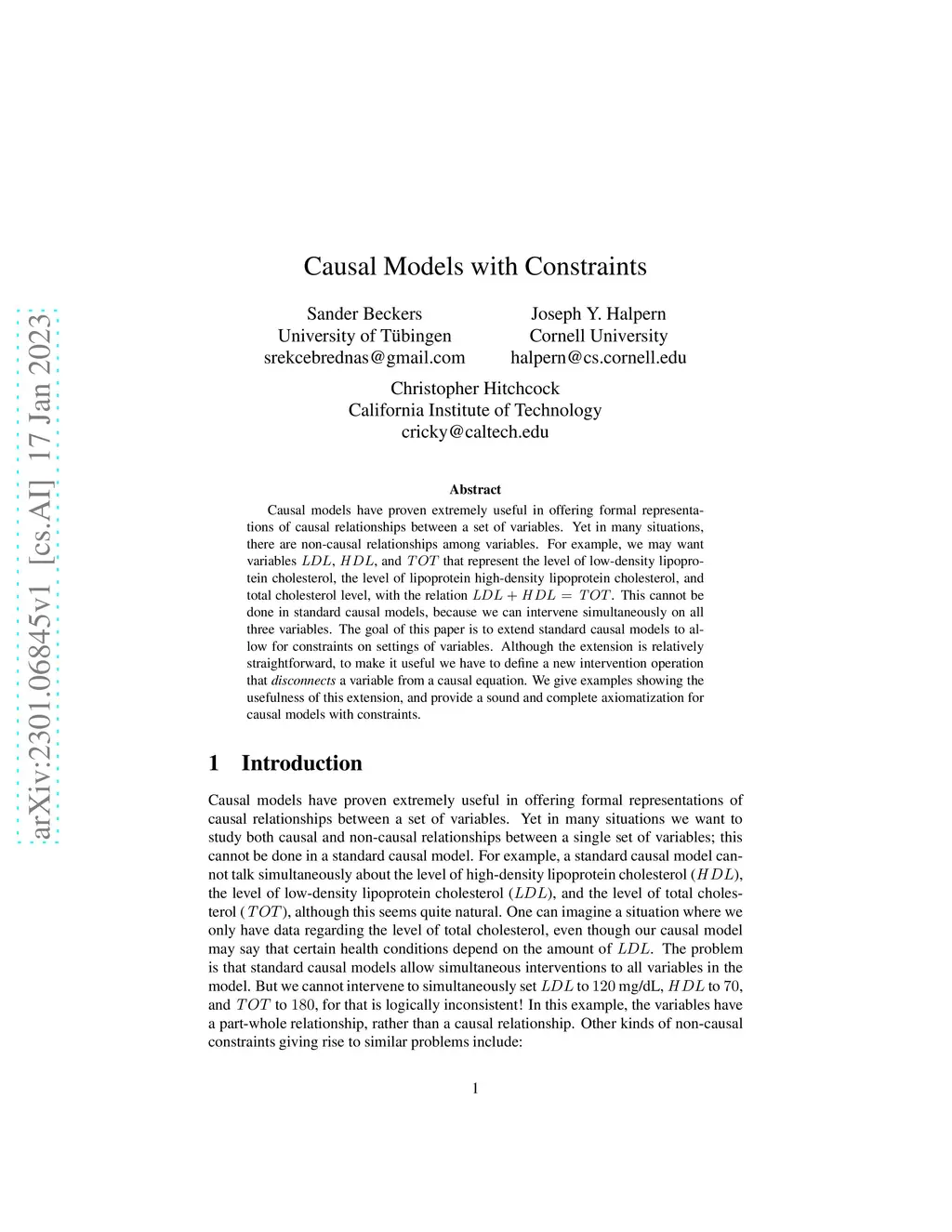 Causal models have proven extremely useful in offering formal representations of causal relationships between a set of variables. Yet in many situations, there are non-causal relationships among variables. For example, we may want variables , , and that represent the level of low-density lipoprotein cholesterol, the level of lipoprotein high-density lipoprotein cholesterol, and total cholesterol level, with the relation . This cannot be done in standard causal models, because we can intervene simultaneously on all three variables. The goal of this paper is to extend standard causal models to allow for constraints on settings of variables. Although the extension is relatively straightforward, to make it useful we have to define a new intervention operation that a variable from a causal equation. We give examples showing the usefulness of this extension, and provide a sound and complete axiomatization for causal models with constraints.