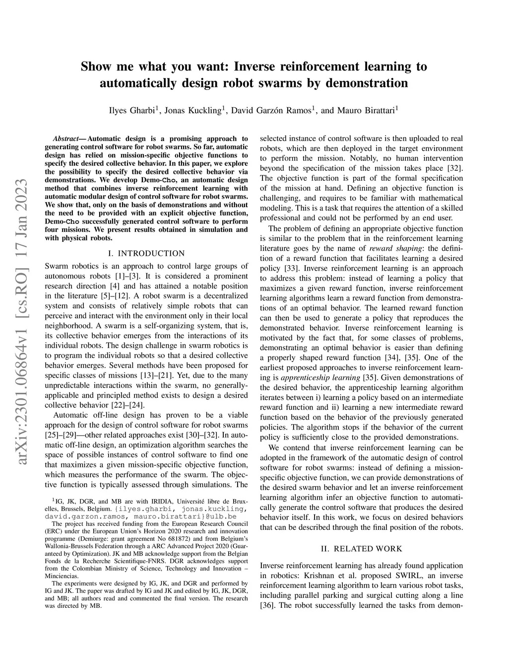 Automatic design is a promising approach to generating control software for robot swarms. So far, automatic design has relied on mission-specific objective functions to specify the desired collective behavior. In this paper, we explore the possibility to specify the desired collective behavior via demonstrations. We develop Demo-Cho, an automatic design method that combines inverse reinforcement learning with automatic modular design of control software for robot swarms. We show that, only on the basis of demonstrations and without the need to be provided with an explicit objective function, Demo-Cho successfully generated control software to perform four missions. We present results obtained in simulation and with physical robots.