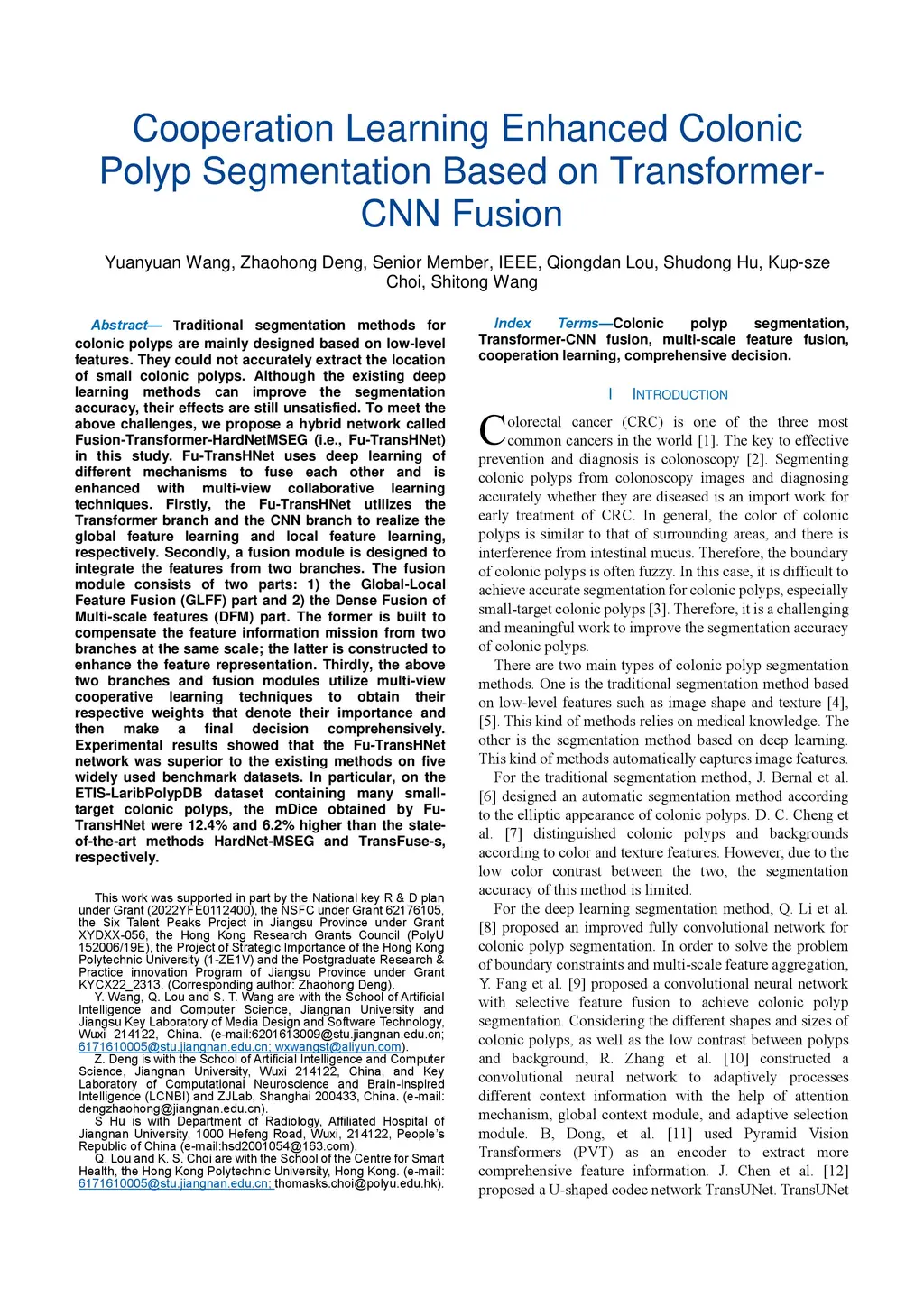 Traditional segmentation methods for colonic polyps are mainly designed based on low-level features. They could not accurately extract the location of small colonic polyps. Although the existing deep learning methods can improve the segmentation accuracy, their effects are still unsatisfied. To meet the above challenges, we propose a hybrid network called Fusion-Transformer-HardNetMSEG (i.e., Fu-TransHNet) in this study. Fu-TransHNet uses deep learning of different mechanisms to fuse each other and is enhanced with multi-view collaborative learning techniques. Firstly, the Fu-TransHNet utilizes the Transformer branch and the CNN branch to realize the global feature learning and local feature learning, respectively. Secondly, a fusion module is designed to integrate the features from two branches. The fusion module consists of two parts: 1) the Global-Local Feature Fusion (GLFF) part and 2) the Dense Fusion of Multi-scale features (DFM) part. The former is built to compensate the feature information mission from two branches at the same scale; the latter is constructed to enhance the feature representation. Thirdly, the above two branches and fusion modules utilize multi-view cooperative learning techniques to obtain their respective weights that denote their importance and then make a final decision comprehensively. Experimental results showed that the Fu-TransHNet network was superior to the existing methods on five widely used benchmark datasets. In particular, on the ETIS-LaribPolypDB dataset containing many small-target colonic polyps, the mDice obtained by Fu-TransHNet were 12.4% and 6.2% higher than the state-of-the-art methods HardNet-MSEG and TransFuse-s, respectively.