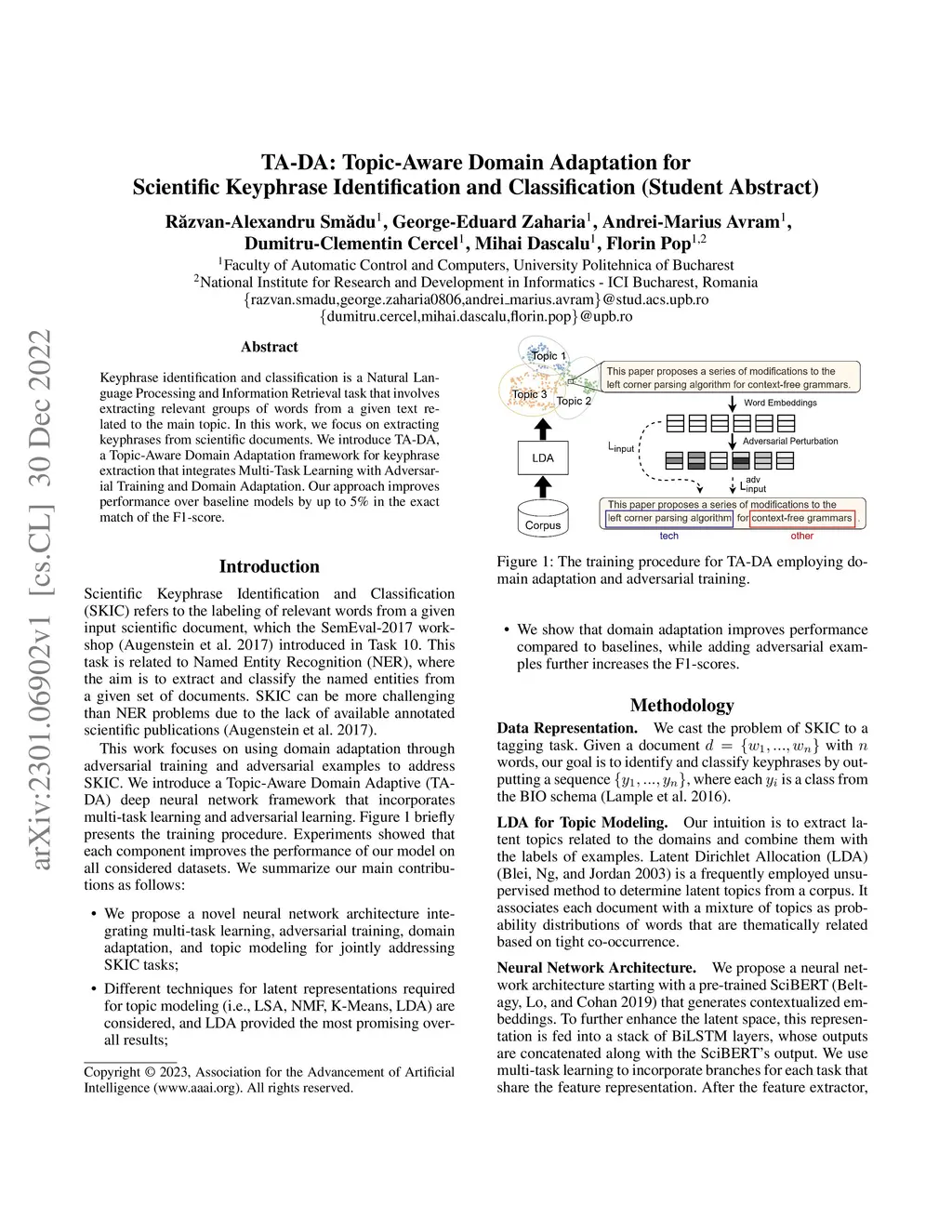 Keyphrase identification and classification is a Natural Language Processing and Information Retrieval task that involves extracting relevant groups of words from a given text related to the main topic. In this work, we focus on extracting keyphrases from scientific documents. We introduce TA-DA, a Topic-Aware Domain Adaptation framework for keyphrase extraction that integrates Multi-Task Learning with Adversarial Training and Domain Adaptation. Our approach improves performance over baseline models by up to 5% in the exact match of the F1-score.