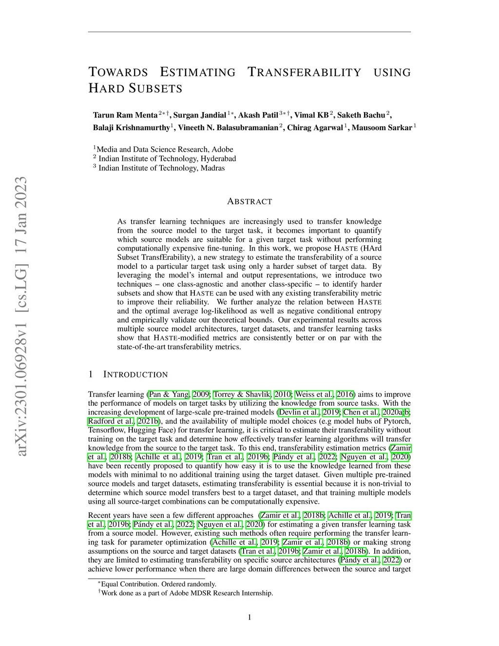 As transfer learning techniques are increasingly used to transfer knowledge from the source model to the target task, it becomes important to quantify which source models are suitable for a given target task without performing computationally expensive fine tuning. In this work, we propose HASTE (HArd Subset TransfErability), a new strategy to estimate the transferability of a source model to a particular target task using only a harder subset of target data. By leveraging the internal and output representations of model, we introduce two techniques, one class agnostic and another class specific, to identify harder subsets and show that HASTE can be used with any existing transferability metric to improve their reliability. We further analyze the relation between HASTE and the optimal average log likelihood as well as negative conditional entropy and empirically validate our theoretical bounds. Our experimental results across multiple source model architectures, target datasets, and transfer learning tasks show that HASTE modified metrics are consistently better or on par with the state of the art transferability metrics.