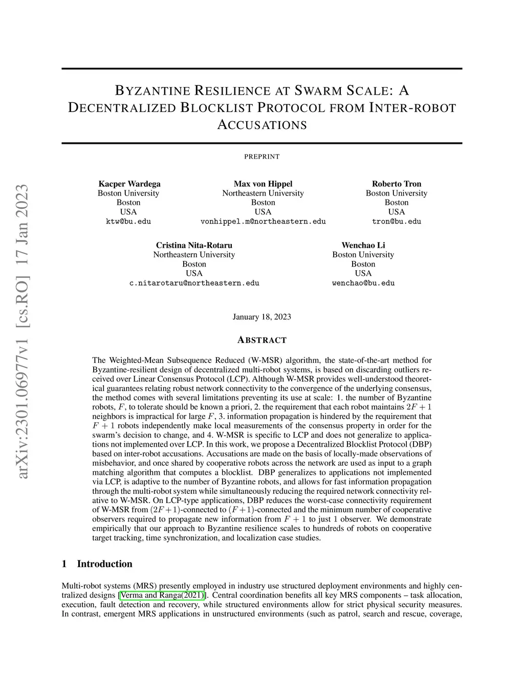 The Weighted-Mean Subsequence Reduced (W-MSR) algorithm, the state-of-the-art method for Byzantine-resilient design of decentralized multi-robot systems, is based on discarding outliers received over Linear Consensus Protocol (LCP). Although W-MSR provides well-understood theoretical guarantees relating robust network connectivity to the convergence of the underlying consensus, the method comes with several limitations preventing its use at scale: (1) the number of Byzantine robots, F, to tolerate should be known a priori, (2) the requirement that each robot maintains 2F+1 neighbors is impractical for large F, (3) information propagation is hindered by the requirement that F+1 robots independently make local measurements of the consensus property in order for the swarm's decision to change, and (4) W-MSR is specific to LCP and does not generalize to applications not implemented over LCP. In this work, we propose a Decentralized Blocklist Protocol (DBP) based on inter-robot accusations. Accusations are made on the basis of locally-made observations of misbehavior, and once shared by cooperative robots across the network are used as input to a graph matching algorithm that computes a blocklist. DBP generalizes to applications not implemented via LCP, is adaptive to the number of Byzantine robots, and allows for fast information propagation through the multi-robot system while simultaneously reducing the required network connectivity relative to W-MSR. On LCP-type applications, DBP reduces the worst-case connectivity requirement of W-MSR from (2F+1)-connected to (F+1)-connected and the number of cooperative observers required to propagate new information from F+1 to just 1 observer. We demonstrate empirically that our approach to Byzantine resilience scales to hundreds of robots on cooperative target tracking, time synchronization, and localization case studies.
