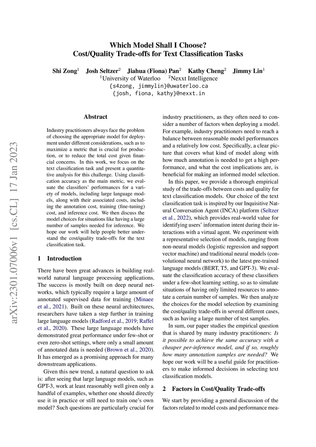 Which Model Shall I Choose? Cost/Quality Trade-offs for Text