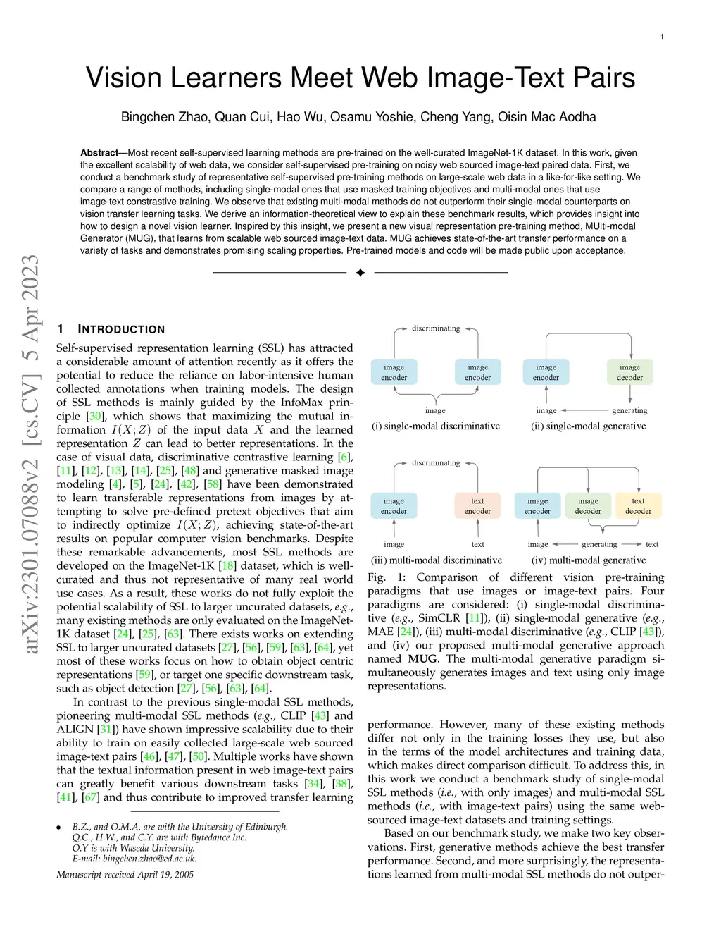 Most recent self-supervised learning methods are pre-trained on the well-curated ImageNet-1K dataset. In this work, given the excellent scalability of web data, we consider self-supervised pre-training on noisy web sourced image-text paired data. First, we conduct a benchmark study of representative self-supervised pre-training methods on large-scale web data in a like-for-like setting. We compare a range of methods, including single-modal ones that use masked training objectives and multi-modal ones that use image-text constrastive training. We observe that existing multi-modal methods do not outperform their single-modal counterparts on vision transfer learning tasks. We derive an information-theoretical view to explain these benchmark results, which provides insight into how to design a novel vision learner. Inspired by this insight, we present a new visual representation pre-training method, MUlti-modal Generator~(MUG), that learns from scalable web sourced image-text data. MUG achieves state-of-the-art transfer performance on a variety of tasks and demonstrates promising scaling properties. Pre-trained models and code will be made public upon acceptance.