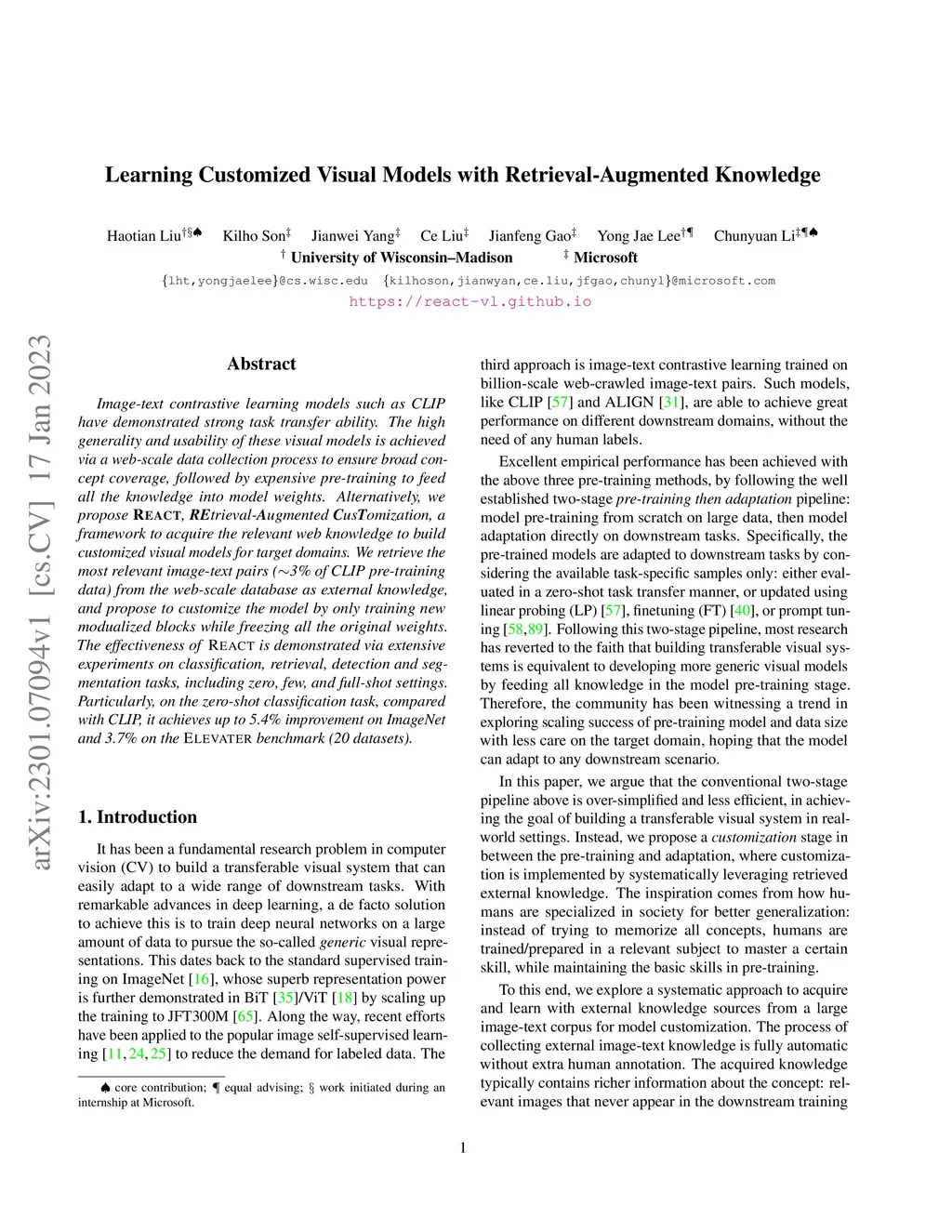 Image-text contrastive learning models such as CLIP have demonstrated strong task transfer ability. The high generality and usability of these visual models is achieved via a web-scale data collection process to ensure broad concept coverage, followed by expensive pre-training to feed all the knowledge into model weights. Alternatively, we propose REACT, REtrieval-Augmented CusTomization, a framework to acquire the relevant web knowledge to build customized visual models for target domains. We retrieve the most relevant image-text pairs (~3% of CLIP pre-training data) from the web-scale database as external knowledge, and propose to customize the model by only training new modualized blocks while freezing all the original weights. The effectiveness of REACT is demonstrated via extensive experiments on classification, retrieval, detection and segmentation tasks, including zero, few, and full-shot settings. Particularly, on the zero-shot classification task, compared with CLIP, it achieves up to 5.4% improvement on ImageNet and 3.7% on the ELEVATER benchmark (20 datasets).