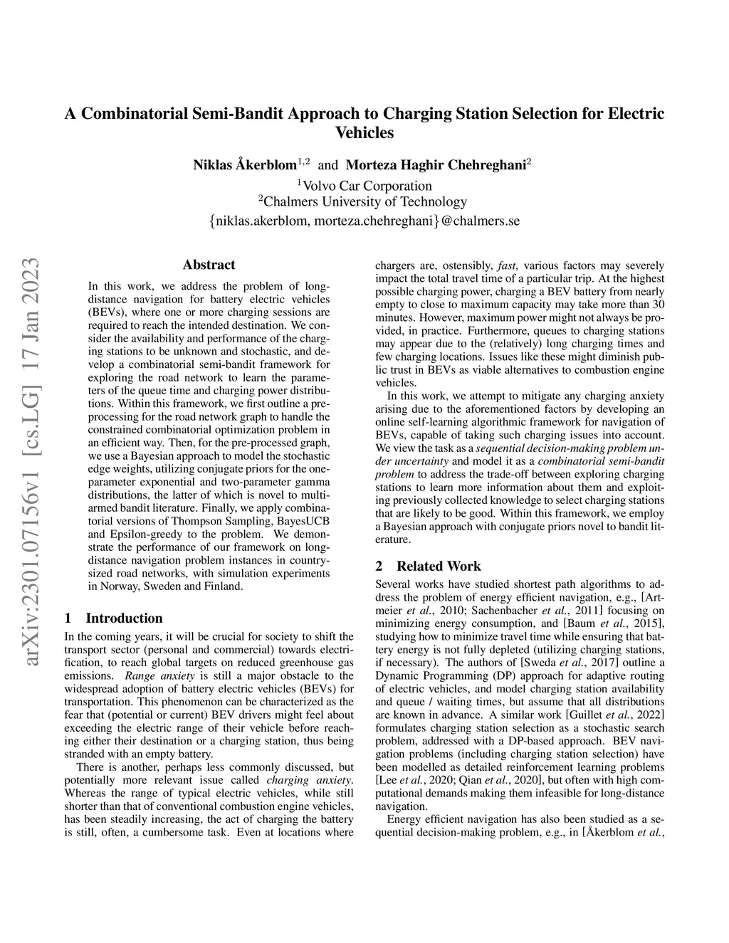 In this work, we address the problem of long-distance navigation for battery electric vehicles (BEVs), where one or more charging sessions are required to reach the intended destination. We consider the availability and performance of the charging stations to be unknown and stochastic, and develop a combinatorial semi-bandit framework for exploring the road network to learn the parameters of the queue time and charging power distributions. Within this framework, we first outline a pre-processing for the road network graph to handle the constrained combinatorial optimization problem in an efficient way. Then, for the pre-processed graph, we use a Bayesian approach to model the stochastic edge weights, utilizing conjugate priors for the one-parameter exponential and two-parameter gamma distributions, the latter of which is novel to multi-armed bandit literature. Finally, we apply combinatorial versions of Thompson Sampling, BayesUCB and Epsilon-greedy to the problem. We demonstrate the performance of our framework on long-distance navigation problem instances in country-sized road networks, with simulation experiments in Norway, Sweden and Finland.