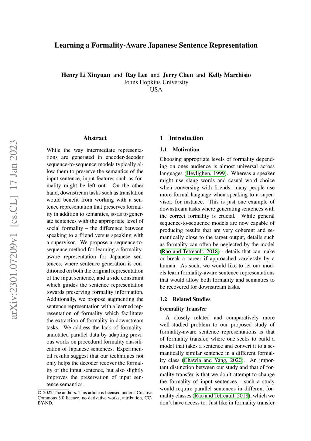 While the way intermediate representations are generated in encoder-decoder sequence-to-sequence models typically allow them to preserve the semantics of the input sentence, input features such as formality might be left out. On the other hand, downstream tasks such as translation would benefit from working with a sentence representation that preserves formality in addition to semantics, so as to generate sentences with the appropriate level of social formality -- the difference between speaking to a friend versus speaking with a supervisor. We propose a sequence-to-sequence method for learning a formality-aware representation for Japanese sentences, where sentence generation is conditioned on both the original representation of the input sentence, and a side constraint which guides the sentence representation towards preserving formality information. Additionally, we propose augmenting the sentence representation with a learned representation of formality which facilitates the extraction of formality in downstream tasks. We address the lack of formality-annotated parallel data by adapting previous works on procedural formality classification of Japanese sentences. Experimental results suggest that our techniques not only helps the decoder recover the formality of the input sentence, but also slightly improves the preservation of input sentence semantics.