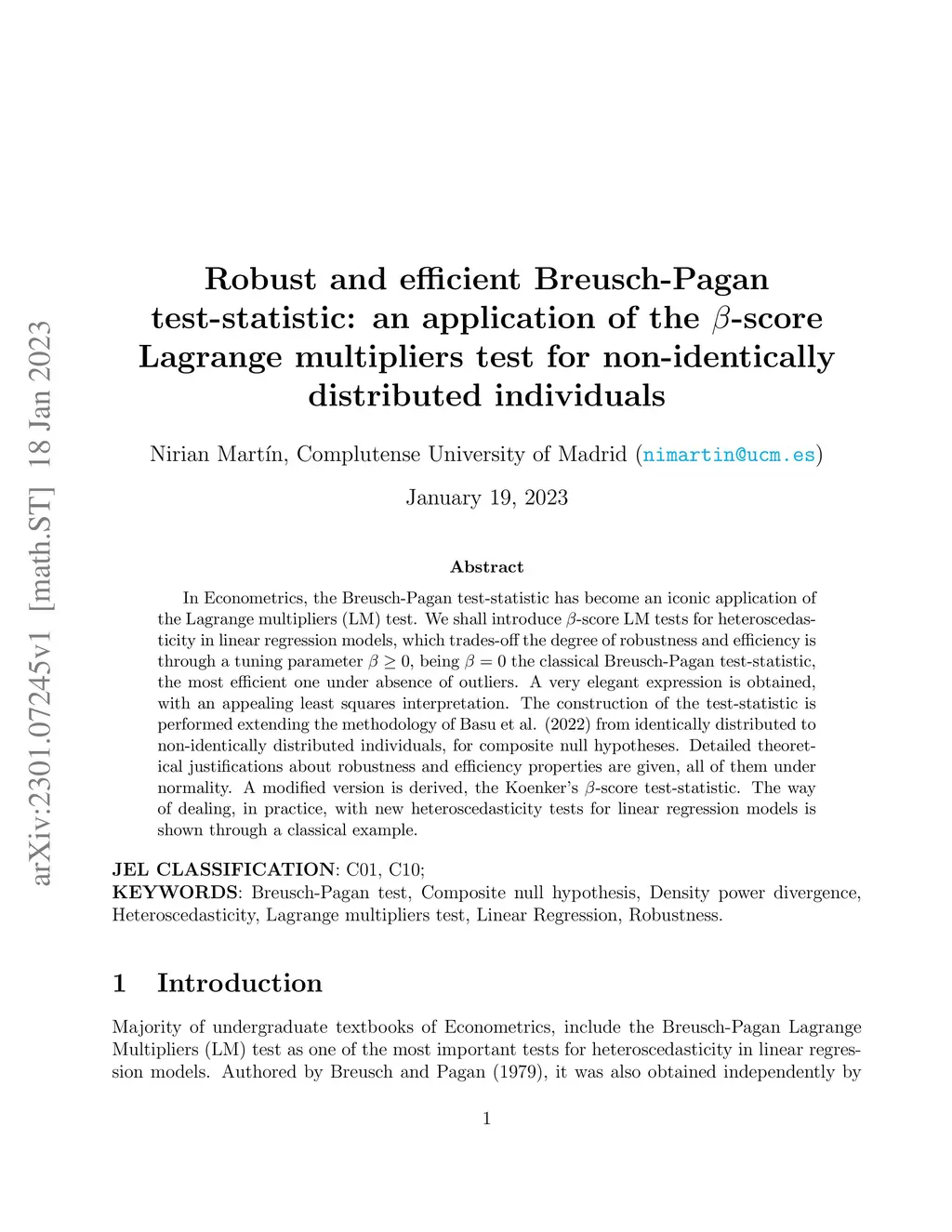 Robust and efficient Breusch-Pagan test-statistic: an application of the