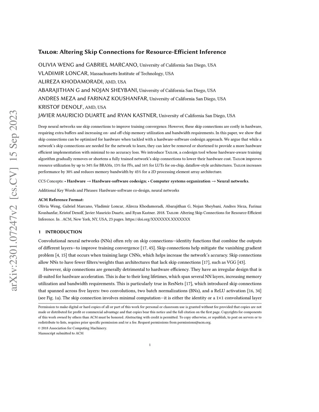 Deep neural networks use skip connections to improve training convergence. However, these skip connections are costly in hardware, requiring extra buffers and increasing on- and off-chip memory utilization and bandwidth requirements. In this paper, we show that skip connections can be optimized for hardware when tackled with a hardware-software codesign approach. We argue that while a network's skip connections are needed for the network to learn, they can later be removed or shortened to provide a more hardware efficient implementation with minimal to no accuracy loss. We introduce Tailor, a codesign tool whose hardware-aware training algorithm gradually removes or shortens a fully trained network's skip connections to lower their hardware cost. Tailor improves resource utilization by up to 34% for BRAMs, 13% for FFs, and 16% for LUTs for on-chip, dataflow-style architectures. Tailor increases performance by 30% and reduces memory bandwidth by 45% for a 2D processing element array architecture.