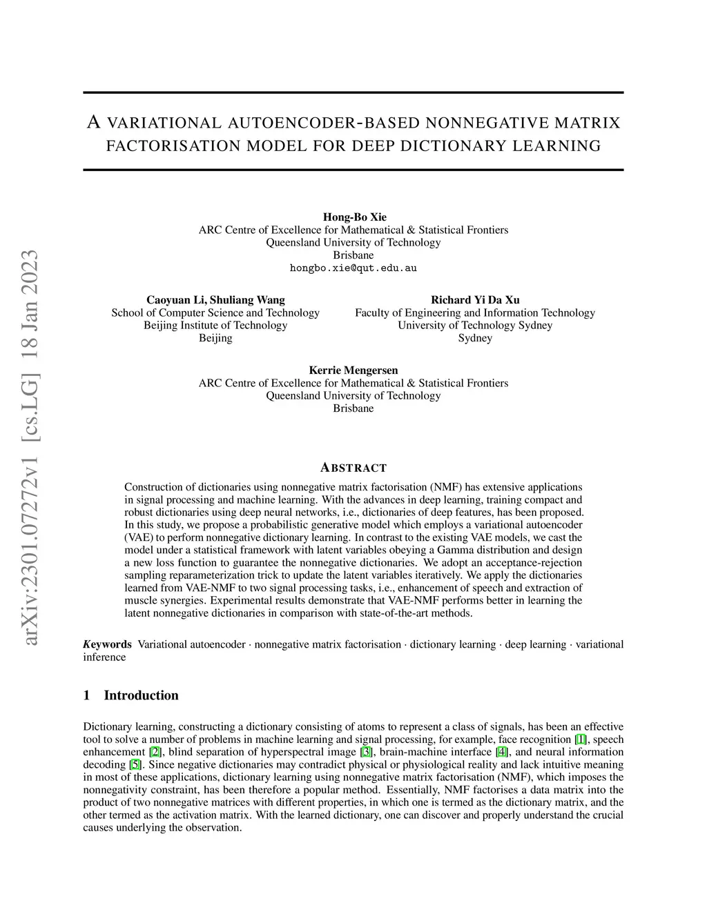 Construction of dictionaries using nonnegative matrix factorisation (NMF) has extensive applications in signal processing and machine learning. With the advances in deep learning, training compact and robust dictionaries using deep neural networks, i.e., dictionaries of deep features, has been proposed. In this study, we propose a probabilistic generative model which employs a variational autoencoder (VAE) to perform nonnegative dictionary learning. In contrast to the existing VAE models, we cast the model under a statistical framework with latent variables obeying a Gamma distribution and design a new loss function to guarantee the nonnegative dictionaries. We adopt an acceptance-rejection sampling reparameterization trick to update the latent variables iteratively. We apply the dictionaries learned from VAE-NMF to two signal processing tasks, i.e., enhancement of speech and extraction of muscle synergies. Experimental results demonstrate that VAE-NMF performs better in learning the latent nonnegative dictionaries in comparison with state-of-the-art methods.