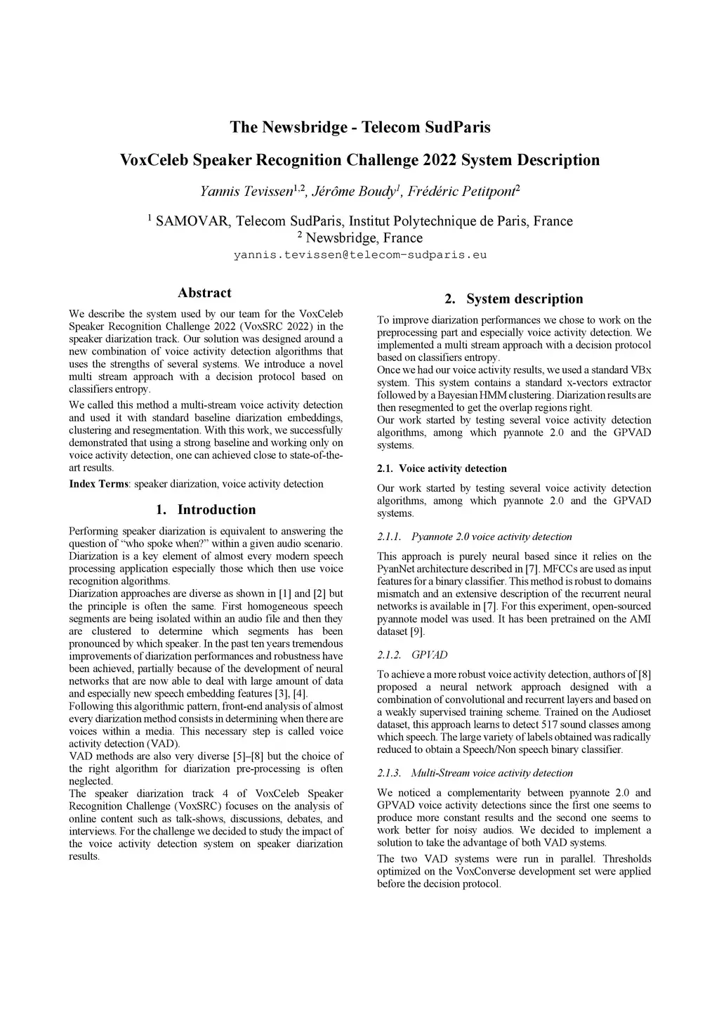 The Newsbridge -Telecom SudParis VoxCeleb Speaker Recognition Challenge