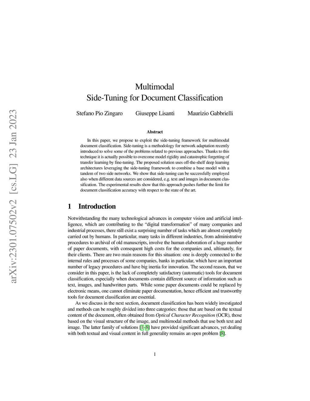 In this paper, we propose to exploit the side-tuning framework for multimodal document classification. Side-tuning is a methodology for network adaptation recently introduced to solve some of the problems related to previous approaches. Thanks to this technique it is actually possible to overcome model rigidity and catastrophic forgetting of transfer learning by fine-tuning. The proposed solution uses off-the-shelf deep learning architectures leveraging the side-tuning framework to combine a base model with a tandem of two side networks. We show that side-tuning can be successfully employed also when different data sources are considered, e.g. text and images in document classification. The experimental results show that this approach pushes further the limit for document classification accuracy with respect to the state of the art.