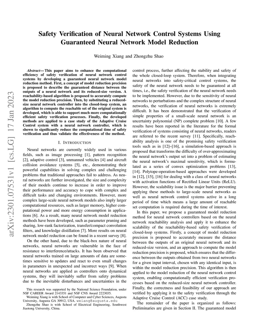This paper aims to enhance the computational efficiency of safety verification of neural network control systems by developing a guaranteed neural network model reduction method. First, a concept of model reduction precision is proposed to describe the guaranteed distance between the outputs of a neural network and its reduced-size version. A reachability-based algorithm is proposed to accurately compute the model reduction precision. Then, by substituting a reduced-size neural network controller into the closed-loop system, an algorithm to compute the reachable set of the original system is developed, which is able to support much more computationally efficient safety verification processes. Finally, the developed methods are applied to a case study of the Adaptive Cruise Control system with a neural network controller, which is shown to significantly reduce the computational time of safety verification and thus validate the effectiveness of the method.