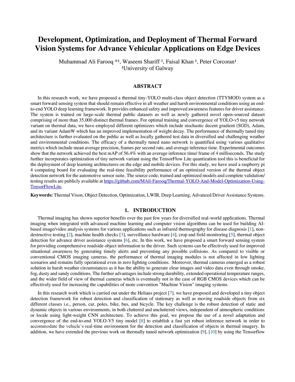 In this research work, we have proposed a thermal tiny-YOLO multi-class object detection (TTYMOD) system as a smart forward sensing system that should remain effective in all weather and harsh environmental conditions using an end-to-end YOLO deep learning framework. It provides enhanced safety and improved awareness features for driver assistance. The system is trained on large-scale thermal public datasets as well as newly gathered novel open-sourced dataset comprising of more than 35,000 distinct thermal frames. For optimal training and convergence of YOLO-v5 tiny network variant on thermal data, we have employed different optimizers which include stochastic decent gradient (SGD), Adam, and its variant AdamW which has an improved implementation of weight decay. The performance of thermally tuned tiny architecture is further evaluated on the public as well as locally gathered test data in diversified and challenging weather and environmental conditions. The efficacy of a thermally tuned nano network is quantified using various qualitative metrics which include mean average precision, frames per second rate, and average inference time. Experimental outcomes show that the network achieved the best mAP of 56.4% with an average inference time/ frame of 4 milliseconds. The study further incorporates optimization of tiny network variant using the TensorFlow Lite quantization tool this is beneficial for the deployment of deep learning architectures on the edge and mobile devices. For this study, we have used a raspberry pi 4 computing board for evaluating the real-time feasibility performance of an optimized version of the thermal object detection network for the automotive sensor suite. The source code, trained and optimized models and complete validation/ testing results are publicly available at https://github.com/MAli-Farooq/Thermal-YOLO-And-Model-Optimization-Using-TensorFlowLite.