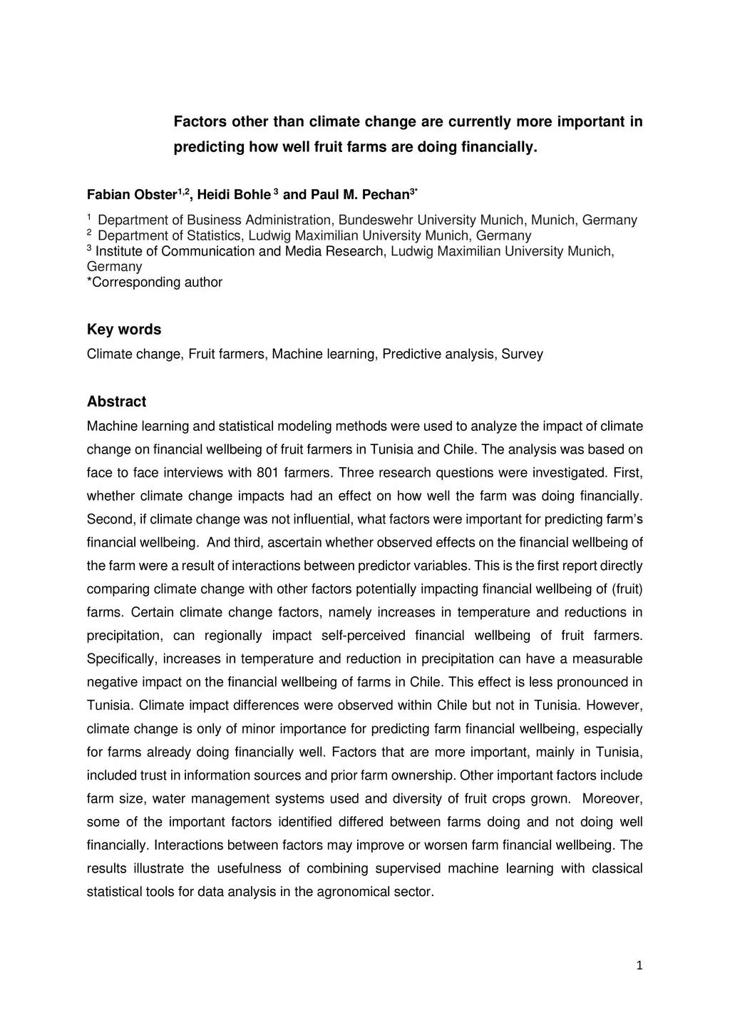Machine learning and statistical modeling methods were used to analyze the impact of climate change on financial wellbeing of fruit farmers in Tunisia and Chile. The analysis was based on face to face interviews with 801 farmers. Three research questions were investigated. First, whether climate change impacts had an effect on how well the farm was doing financially. Second, if climate change was not influential, what factors were important for predicting financial wellbeing of the farm. And third, ascertain whether observed effects on the financial wellbeing of the farm were a result of interactions between predictor variables. This is the first report directly comparing climate change with other factors potentially impacting financial wellbeing of farms. Certain climate change factors, namely increases in temperature and reductions in precipitation, can regionally impact self-perceived financial wellbeing of fruit farmers. Specifically, increases in temperature and reduction in precipitation can have a measurable negative impact on the financial wellbeing of farms in Chile. This effect is less pronounced in Tunisia. Climate impact differences were observed within Chile but not in Tunisia. However, climate change is only of minor importance for predicting farm financial wellbeing, especially for farms already doing financially well. Factors that are more important, mainly in Tunisia, included trust in information sources and prior farm ownership. Other important factors include farm size, water management systems used and diversity of fruit crops grown. Moreover, some of the important factors identified differed between farms doing and not doing well financially. Interactions between factors may improve or worsen farm financial wellbeing.