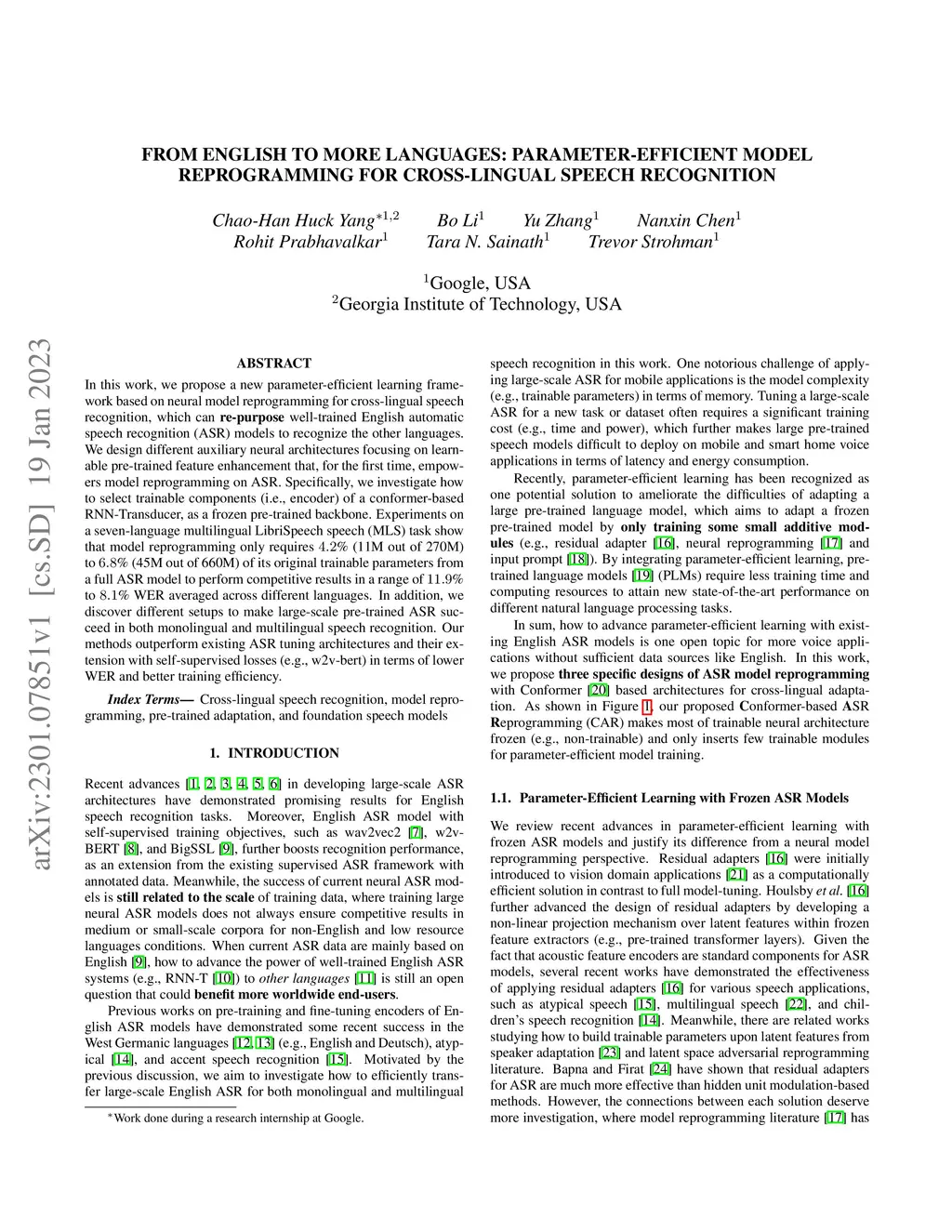 In this work, we propose a new parameter-efficient learning framework based on neural model reprogramming for cross-lingual speech recognition, which can \textbf{re-purpose} well-trained English automatic speech recognition (ASR) models to recognize the other languages. We design different auxiliary neural architectures focusing on learnable pre-trained feature enhancement that, for the first time, empowers model reprogramming on ASR. Specifically, we investigate how to select trainable components (i.e., encoder) of a conformer-based RNN-Transducer, as a frozen pre-trained backbone. Experiments on a seven-language multilingual LibriSpeech speech (MLS) task show that model reprogramming only requires 4.2% (11M out of 270M) to 6.8% (45M out of 660M) of its original trainable parameters from a full ASR model to perform competitive results in a range of 11.9% to 8.1% WER averaged across different languages. In addition, we discover different setups to make large-scale pre-trained ASR succeed in both monolingual and multilingual speech recognition. Our methods outperform existing ASR tuning architectures and their extension with self-supervised losses (e.g., w2v-bert) in terms of lower WER and better training efficiency.