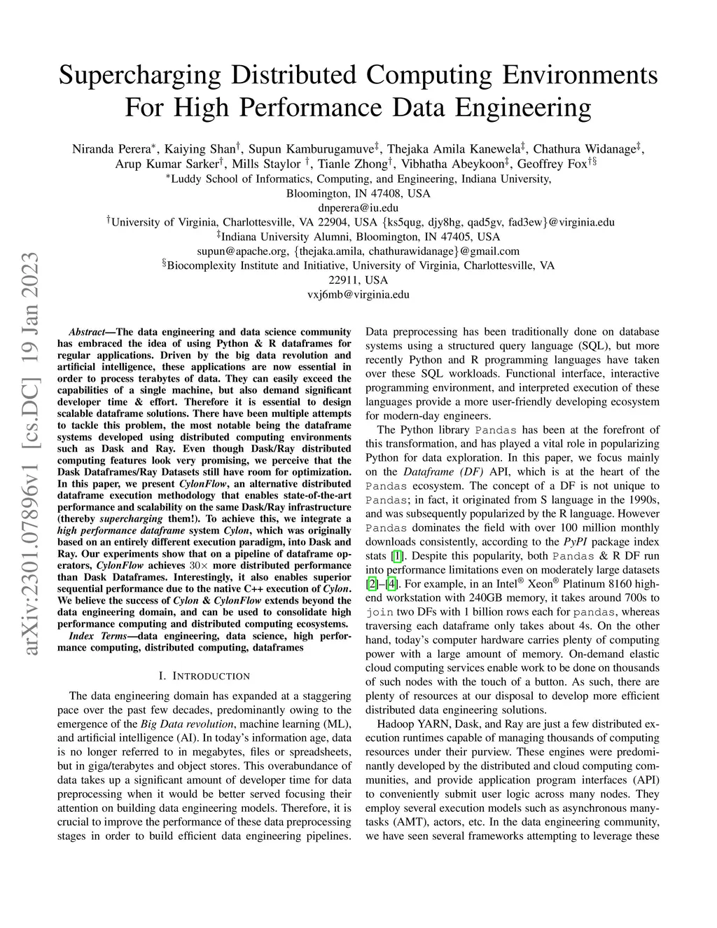 The data engineering and data science community has embraced the idea of using Python & R dataframes for regular applications. Driven by the big data revolution and artificial intelligence, these applications are now essential in order to process terabytes of data. They can easily exceed the capabilities of a single machine, but also demand significant developer time & effort. Therefore it is essential to design scalable dataframe solutions. There have been multiple attempts to tackle this problem, the most notable being the dataframe systems developed using distributed computing environments such as Dask and Ray. Even though Dask/Ray distributed computing features look very promising, we perceive that the Dask Dataframes/Ray Datasets still have room for optimization. In this paper, we present CylonFlow, an alternative distributed dataframe execution methodology that enables state-of-the-art performance and scalability on the same Dask/Ray infrastructure (thereby supercharging them!). To achieve this, we integrate a high performance dataframe system Cylon, which was originally based on an entirely different execution paradigm, into Dask and Ray. Our experiments show that on a pipeline of dataframe operators, CylonFlow achieves 30x more distributed performance than Dask Dataframes. Interestingly, it also enables superior sequential performance due to the native C++ execution of Cylon. We believe the success of Cylon & CylonFlow extends beyond the data engineering domain, and can be used to consolidate high performance computing and distributed computing ecosystems.