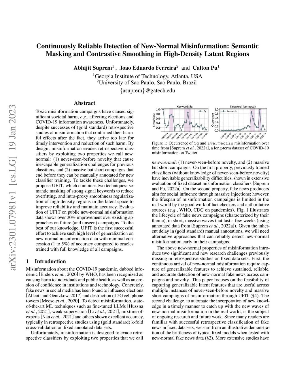 Toxic misinformation campaigns have caused significant societal harm, e.g., affecting elections and COVID-19 information awareness. Unfortunately, despite successes of (gold standard) retrospective studies of misinformation that confirmed their harmful effects after the fact, they arrive too late for timely intervention and reduction of such harm. By design, misinformation evades retrospective classifiers by exploiting two properties we call new-normal: (1) never-seen-before novelty that cause inescapable generalization challenges for previous classifiers, and (2) massive but short campaigns that end before they can be manually annotated for new classifier training. To tackle these challenges, we propose UFIT, which combines two techniques: semantic masking of strong signal keywords to reduce overfitting, and intra-proxy smoothness regularization of high-density regions in the latent space to improve reliability and maintain accuracy. Evaluation of UFIT on public new-normal misinformation data shows over 30% improvement over existing approaches on future (and unseen) campaigns. To the best of our knowledge, UFIT is the first successful effort to achieve such high level of generalization on new-normal misinformation data with minimal concession (1 to 5%) of accuracy compared to oracles trained with full knowledge of all campaigns.
