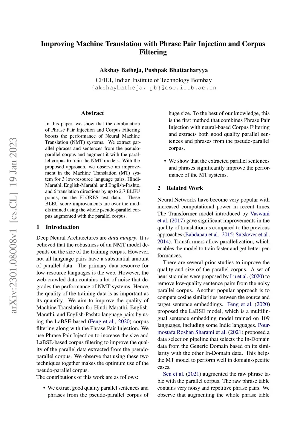 In this paper, we show that the combination of Phrase Pair Injection and Corpus Filtering boosts the performance of Neural Machine Translation (NMT) systems. We extract parallel phrases and sentences from the pseudo-parallel corpus and augment it with the parallel corpus to train the NMT models. With the proposed approach, we observe an improvement in the Machine Translation (MT) system for 3 low-resource language pairs, Hindi-Marathi, English-Marathi, and English-Pashto, and 6 translation directions by up to 2.7 BLEU points, on the FLORES test data. These BLEU score improvements are over the models trained using the whole pseudo-parallel corpus augmented with the parallel corpus.