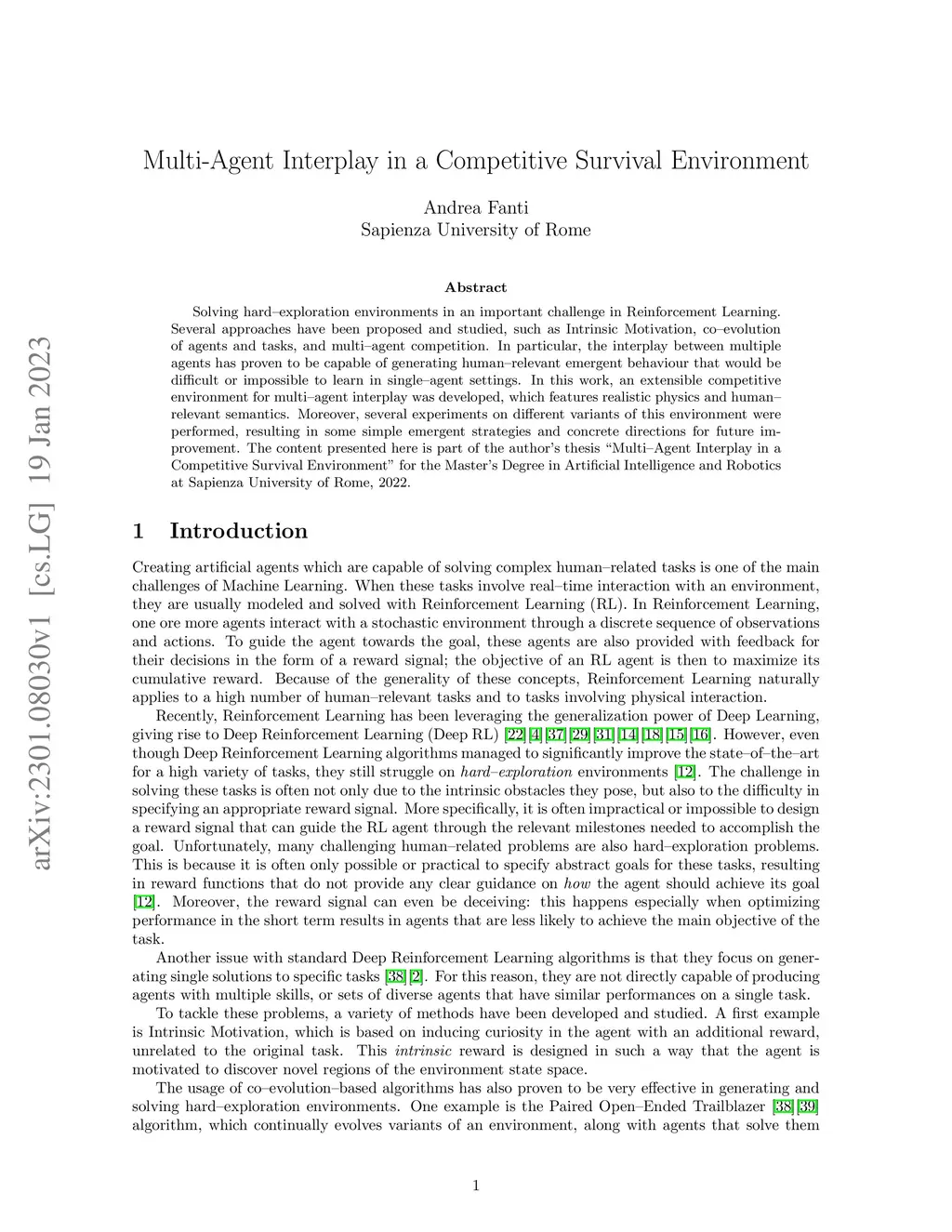 Solving hard-exploration environments in an important challenge in Reinforcement Learning. Several approaches have been proposed and studied, such as Intrinsic Motivation, co-evolution of agents and tasks, and multi-agent competition. In particular, the interplay between multiple agents has proven to be capable of generating human-relevant emergent behaviour that would be difficult or impossible to learn in single-agent settings. In this work, an extensible competitive environment for multi-agent interplay was developed, which features realistic physics and human-relevant semantics. Moreover, several experiments on different variants of this environment were performed, resulting in some simple emergent strategies and concrete directions for future improvement. The content presented here is part of the author's thesis "Multi-Agent Interplay in a Competitive Survival Environment" for the Master's Degree in Artificial Intelligence and Robotics at Sapienza University of Rome, 2022.