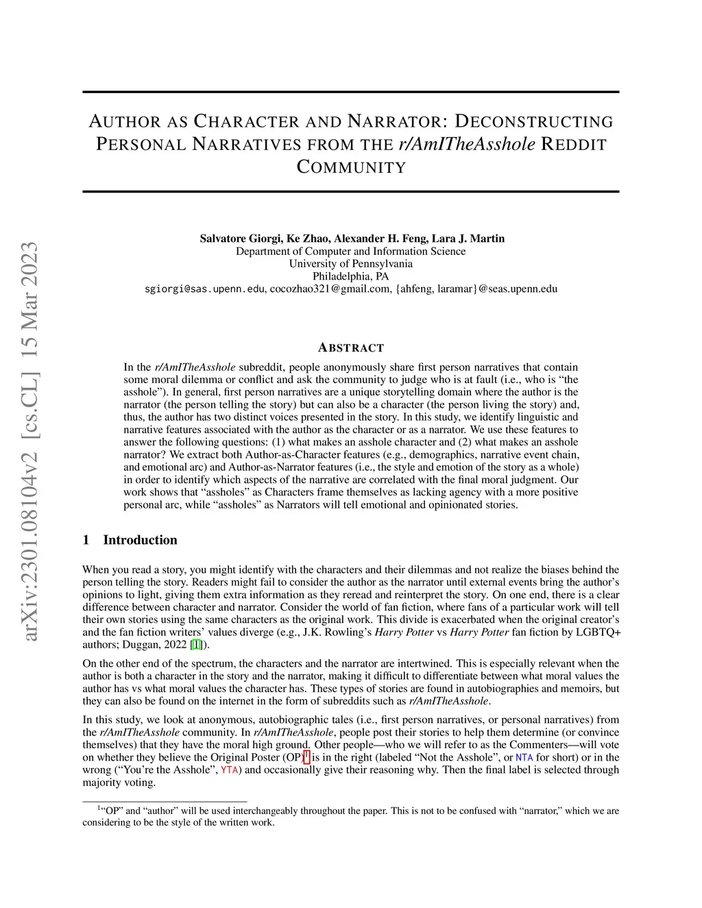 In the r/AmITheAsshole subreddit, people anonymously share first person narratives that contain some moral dilemma or conflict and ask the community to judge who is at fault (i.e., who is "the asshole"). In general, first person narratives are a unique storytelling domain where the author is the narrator (the person telling the story) but can also be a character (the person living the story) and, thus, the author has two distinct voices presented in the story. In this study, we identify linguistic and narrative features associated with the author as the character or as a narrator. We use these features to answer the following questions: (1) what makes an asshole character and (2) what makes an asshole narrator? We extract both Author-as-Character features (e.g., demographics, narrative event chain, and emotional arc) and Author-as-Narrator features (i.e., the style and emotion of the story as a whole) in order to identify which aspects of the narrative are correlated with the final moral judgment. Our work shows that "assholes" as Characters frame themselves as lacking agency with a more positive personal arc, while "assholes" as Narrators will tell emotional and opinionated stories.