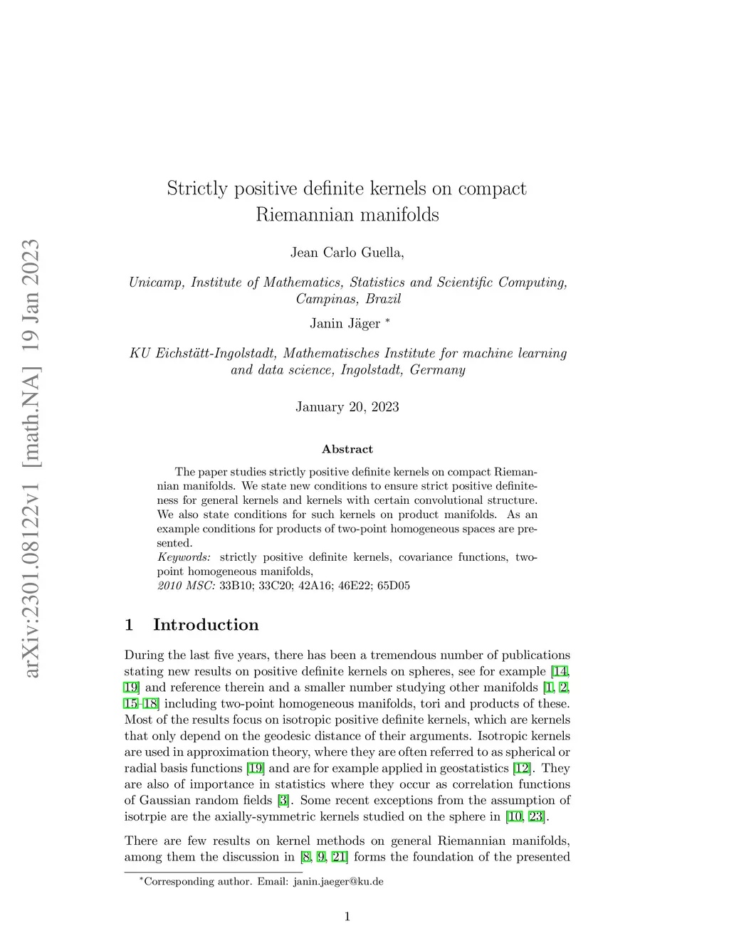 The paper studies strictly positive definite kernels on compact Riemannian manifolds. We state new conditions to ensure strict positive definiteness for general kernels and kernels with certain convolutional structure. We also state conditions for such kernels on product manifolds. As an example conditions for products of two-point homogeneous spaces are presented.