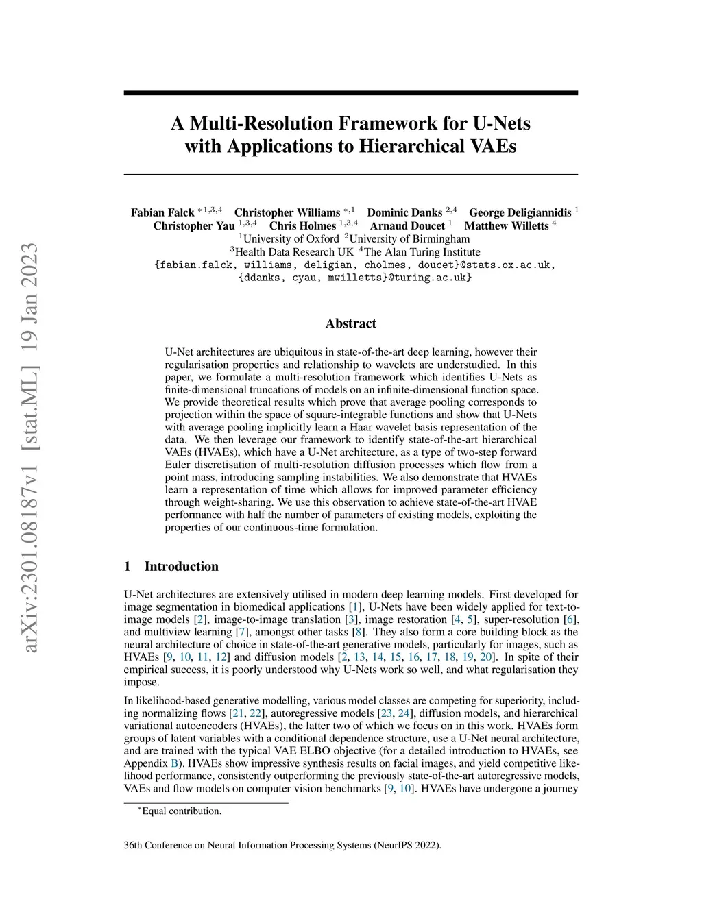 U-Net architectures are ubiquitous in state-of-the-art deep learning, however their regularisation properties and relationship to wavelets are understudied. In this paper, we formulate a multi-resolution framework which identifies U-Nets as finite-dimensional truncations of models on an infinite-dimensional function space. We provide theoretical results which prove that average pooling corresponds to projection within the space of square-integrable functions and show that U-Nets with average pooling implicitly learn a Haar wavelet basis representation of the data. We then leverage our framework to identify state-of-the-art hierarchical VAEs (HVAEs), which have a U-Net architecture, as a type of two-step forward Euler discretisation of multi-resolution diffusion processes which flow from a point mass, introducing sampling instabilities. We also demonstrate that HVAEs learn a representation of time which allows for improved parameter efficiency through weight-sharing. We use this observation to achieve state-of-the-art HVAE performance with half the number of parameters of existing models, exploiting the properties of our continuous-time formulation.