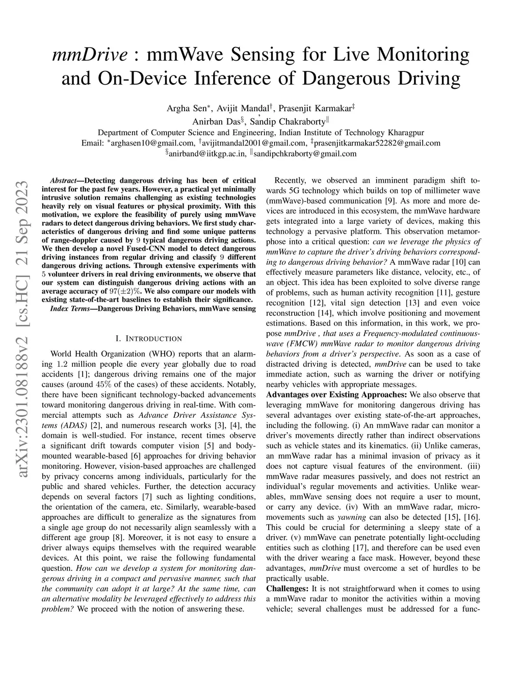 Detecting dangerous driving has been of critical interest for the past few years. However, a practical yet minimally intrusive solution remains challenging as existing technologies heavily rely on visual features or physical proximity. With this motivation, we explore the feasibility of purely using mmWave radars to detect dangerous driving behaviors. We first study characteristics of dangerous driving and find some unique patterns of range-doppler caused by 9 typical dangerous driving actions. We then develop a novel Fused-CNN model to detect dangerous driving instances from regular driving and classify 9 different dangerous driving actions. Through extensive experiments with 5 volunteer drivers in real driving environments, we observe that our system can distinguish dangerous driving actions with an average accuracy of > 95%. We also compare our models with existing state-of-the-art baselines to establish their significance.