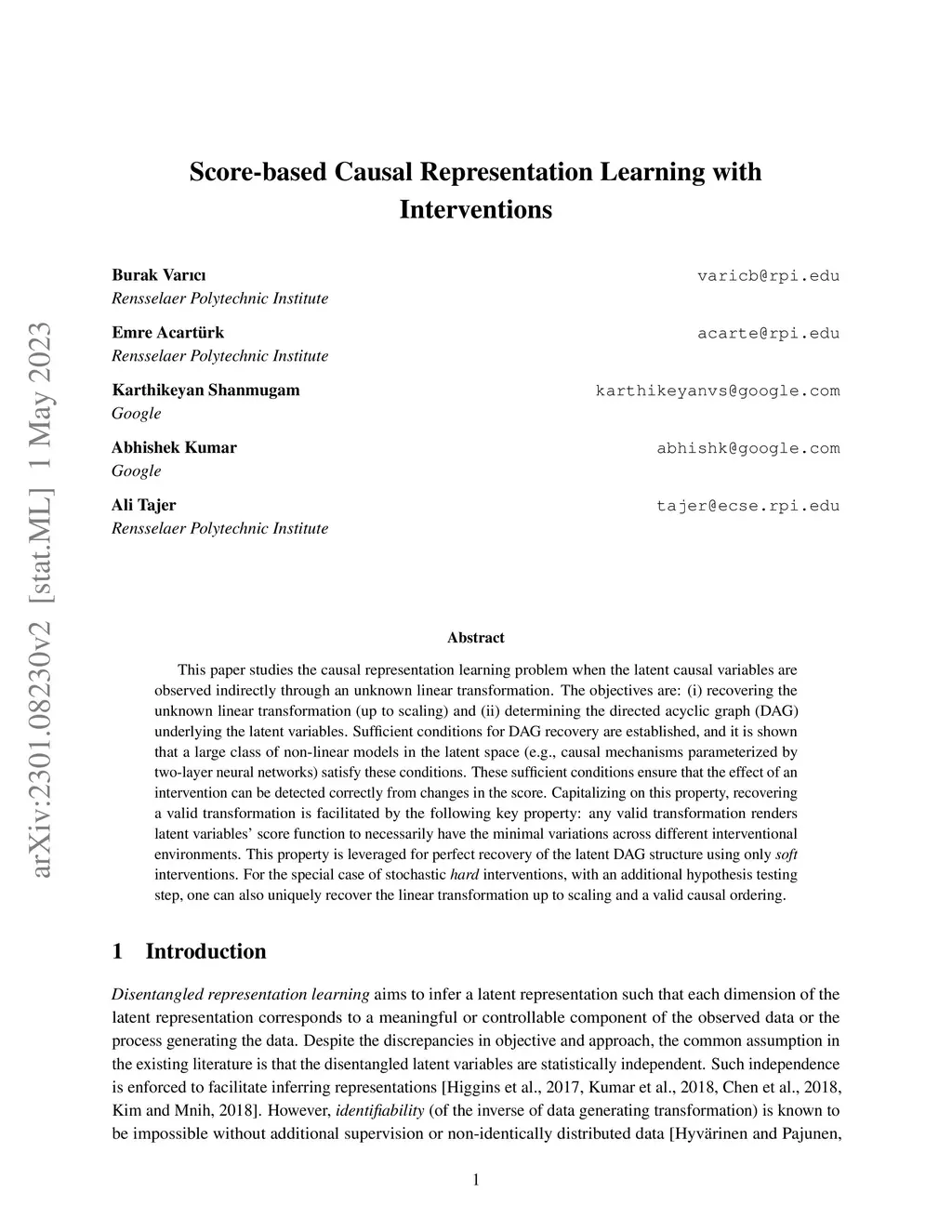 This paper studies the causal representation learning problem when the latent causal variables are observed indirectly through an unknown linear transformation. The objectives are: (i) recovering the unknown linear transformation (up to scaling) and (ii) determining the directed acyclic graph (DAG) underlying the latent variables. Sufficient conditions for DAG recovery are established, and it is shown that a large class of non-linear models in the latent space (e.g., causal mechanisms parameterized by two-layer neural networks) satisfy these conditions. These sufficient conditions ensure that the effect of an intervention can be detected correctly from changes in the score. Capitalizing on this property, recovering a valid transformation is facilitated by the following key property: any valid transformation renders latent variables' score function to necessarily have the minimal variations across different interventional environments. This property is leveraged for perfect recovery of the latent DAG structure using only \emph{soft} interventions. For the special case of stochastic \emph{hard} interventions, with an additional hypothesis testing step, one can also uniquely recover the linear transformation up to scaling and a valid causal ordering.