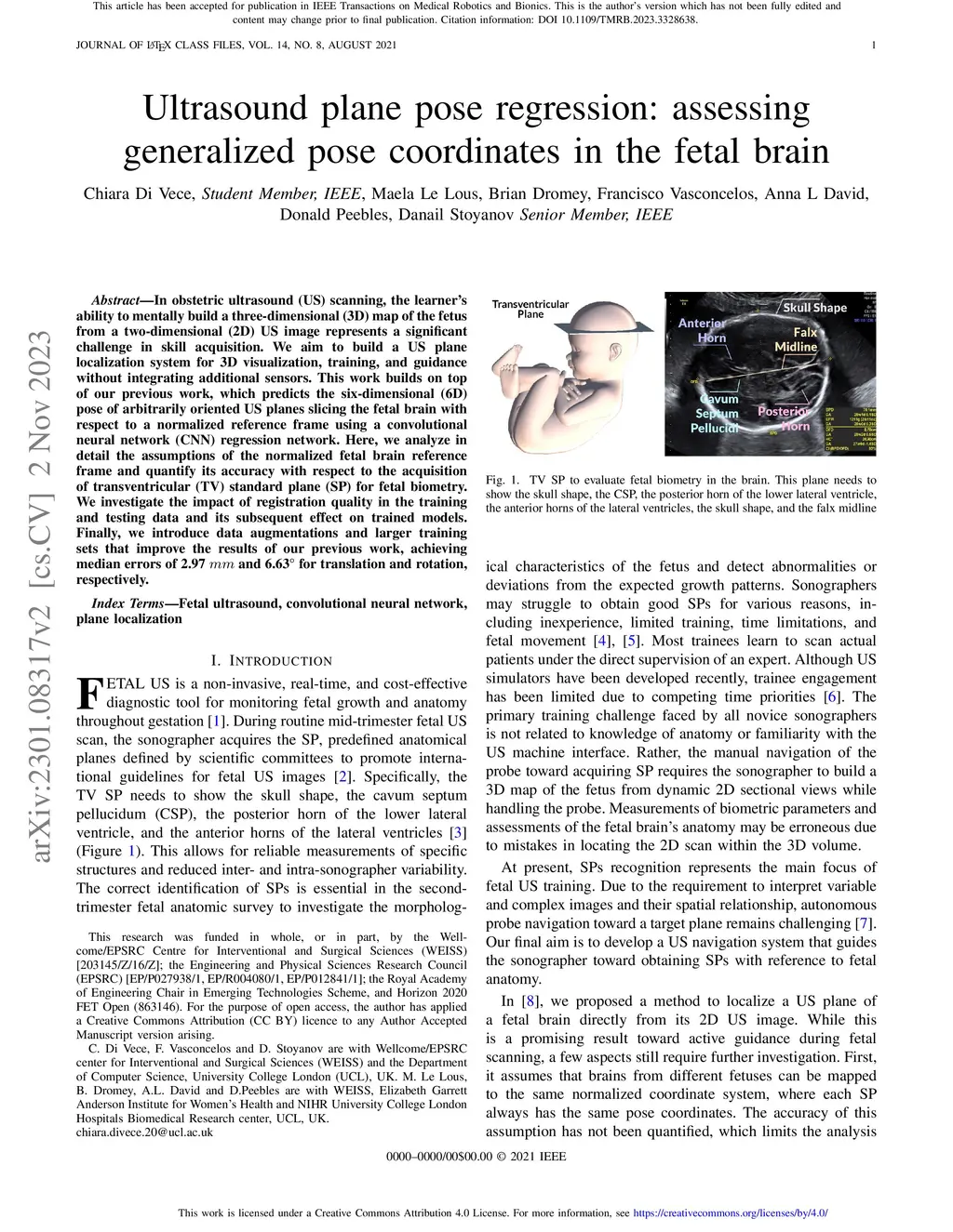 In obstetric ultrasound (US) scanning, the learner's ability to mentally build a three-dimensional (3D) map of the fetus from a two-dimensional (2D) US image represents a significant challenge in skill acquisition. We aim to build a US plane localization system for 3D visualization, training, and guidance without integrating additional sensors. This work builds on top of our previous work, which predicts the six-dimensional (6D) pose of arbitrarily oriented US planes slicing the fetal brain with respect to a normalized reference frame using a convolutional neural network (CNN) regression network. Here, we analyze in detail the assumptions of the normalized fetal brain reference frame and quantify its accuracy with respect to the acquisition of transventricular (TV) standard plane (SP) for fetal biometry. We investigate the impact of registration quality in the training and testing data and its subsequent effect on trained models. Finally, we introduce data augmentations and larger training sets that improve the results of our previous work, achieving median errors of 2.97 mm and 6.63 degrees for translation and rotation, respectively.