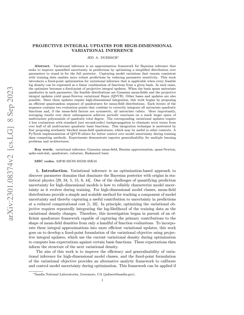 Variational inference is an approximation framework for Bayesian inference that seeks to improve quantified uncertainty in predictions by optimizing a simplified distribution over parameters to stand in for the full posterior. Capturing model variations that remain consistent with training data enables more robust predictions by reducing parameter sensitivity. This work introduces a fixed-point optimization for variational inference that is applicable when every feasible log density can be expressed as a linear combination of functions from a given basis. In such cases, the optimizer becomes a fixed-point of projective integral updates. When the basis spans univariate quadratics in each parameter, feasible densities are Gaussian and the projective integral updates yield quasi-Newton variational Bayes (QNVB). Other bases and updates are also possible. As these updates require high-dimensional integration, this work first proposes an efficient quasirandom quadrature sequence for mean-field distributions. Each iterate of the sequence contains two evaluation points that combine to correctly integrate all univariate quadratics and, if the mean-field factors are symmetric, all univariate cubics. More importantly, averaging results over short subsequences achieves periodic exactness on a much larger space of multivariate quadratics. The corresponding variational updates require 4 loss evaluations with standard (not second-order) backpropagation to eliminate error terms from over half of all multivariate quadratic basis functions. This integration technique is motivated by first proposing stochastic blocked mean-field quadratures, which may be useful in other contexts. A PyTorch implementation of QNVB allows for better control over model uncertainty during training than competing methods. Experiments demonstrate superior generalizability for multiple learning problems and architectures.