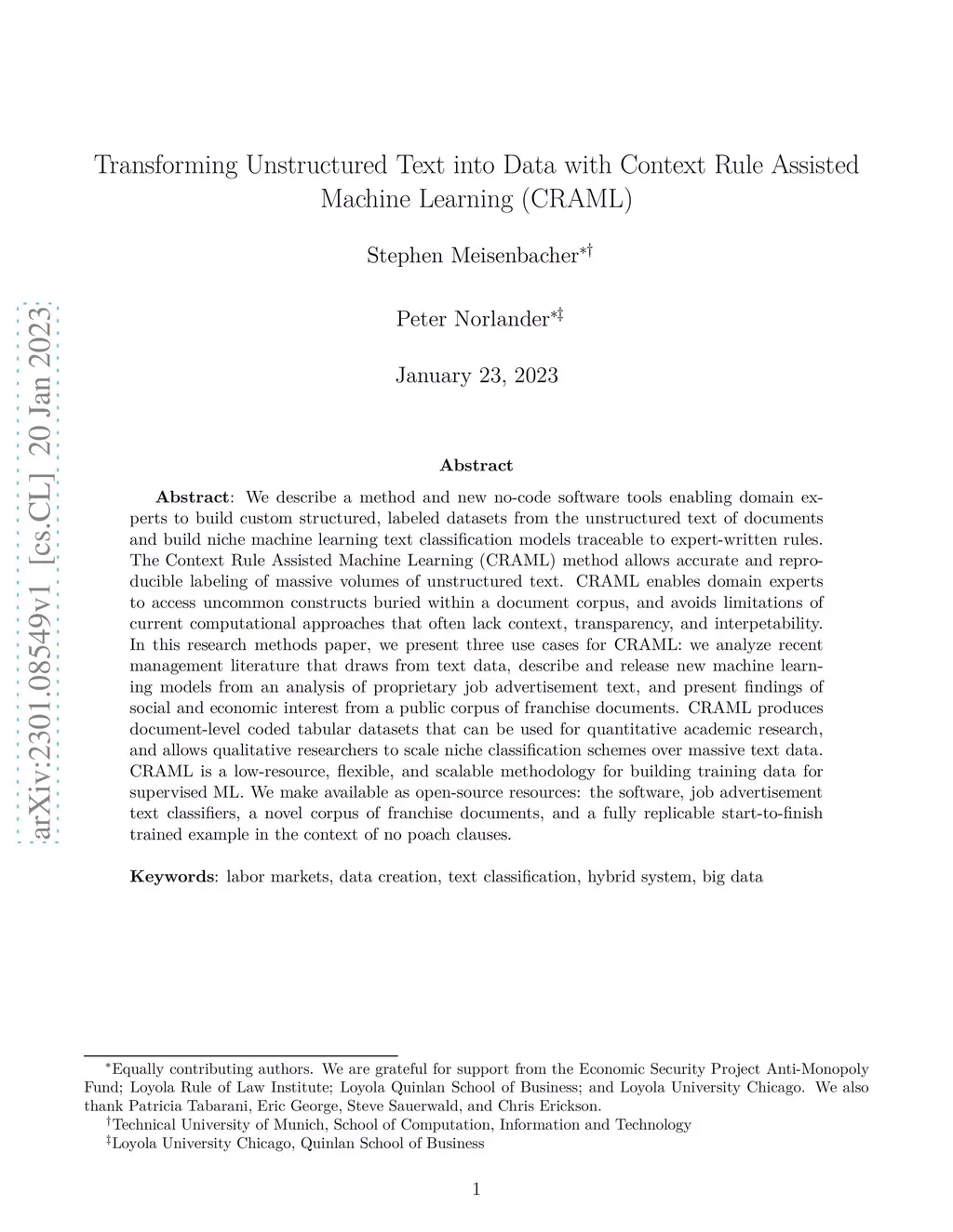 We describe a method and new no-code software tools enabling domain experts to build custom structured, labeled datasets from the unstructured text of documents and build niche machine learning text classification models traceable to expert-written rules. The Context Rule Assisted Machine Learning (CRAML) method allows accurate and reproducible labeling of massive volumes of unstructured text. CRAML enables domain experts to access uncommon constructs buried within a document corpus, and avoids limitations of current computational approaches that often lack context, transparency, and interpetability. In this research methods paper, we present three use cases for CRAML: we analyze recent management literature that draws from text data, describe and release new machine learning models from an analysis of proprietary job advertisement text, and present findings of social and economic interest from a public corpus of franchise documents. CRAML produces document-level coded tabular datasets that can be used for quantitative academic research, and allows qualitative researchers to scale niche classification schemes over massive text data. CRAML is a low-resource, flexible, and scalable methodology for building training data for supervised ML. We make available as open-source resources: the software, job advertisement text classifiers, a novel corpus of franchise documents, and a fully replicable start-to-finish trained example in the context of no poach clauses.
