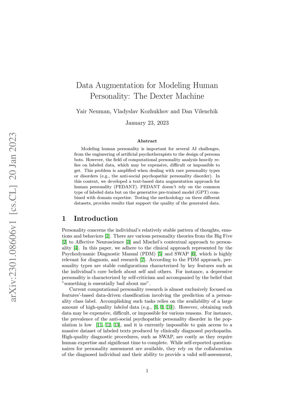 Modeling human personality is important for several AI challenges, from the engineering of artificial psychotherapists to the design of persona bots. However, the field of computational personality analysis heavily relies on labeled data, which may be expensive, difficult or impossible to get. This problem is amplified when dealing with rare personality types or disorders (e.g., the anti-social psychopathic personality disorder). In this context, we developed a text-based data augmentation approach for human personality (PEDANT). PEDANT doesn't rely on the common type of labeled data but on the generative pre-trained model (GPT) combined with domain expertise. Testing the methodology on three different datasets, provides results that support the quality of the generated data.