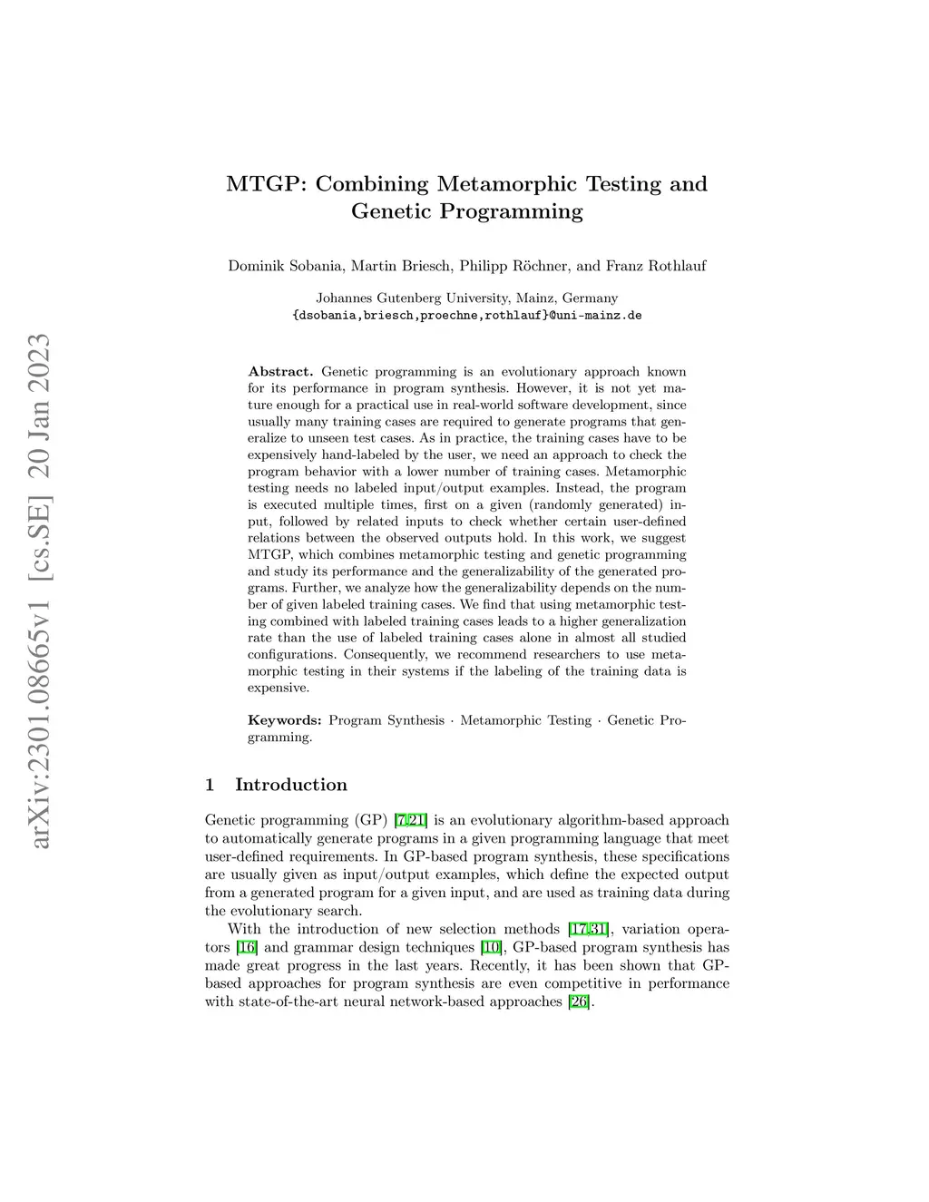 Genetic programming is an evolutionary approach known for its performance in program synthesis. However, it is not yet mature enough for a practical use in real-world software development, since usually many training cases are required to generate programs that generalize to unseen test cases. As in practice, the training cases have to be expensively hand-labeled by the user, we need an approach to check the program behavior with a lower number of training cases. Metamorphic testing needs no labeled input/output examples. Instead, the program is executed multiple times, first on a given (randomly generated) input, followed by related inputs to check whether certain user-defined relations between the observed outputs hold. In this work, we suggest MTGP, which combines metamorphic testing and genetic programming and study its performance and the generalizability of the generated programs. Further, we analyze how the generalizability depends on the number of given labeled training cases. We find that using metamorphic testing combined with labeled training cases leads to a higher generalization rate than the use of labeled training cases alone in almost all studied configurations. Consequently, we recommend researchers to use metamorphic testing in their systems if the labeling of the training data is expensive.