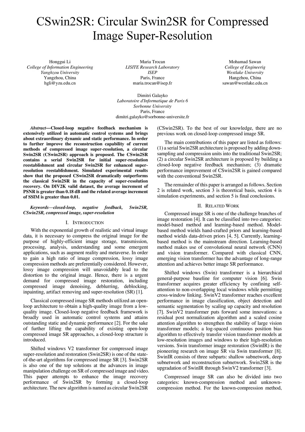 Closed-loop negative feedback mechanism is extensively utilized in automatic control systems and brings about extraordinary dynamic and static performance. In order to further improve the reconstruction capability of current methods of compressed image super-resolution, a circular Swin2SR (CSwin2SR) approach is proposed. The CSwin2SR contains a serial Swin2SR for initial super-resolution reestablishment and circular Swin2SR for enhanced super-resolution reestablishment. Simulated experimental results show that the proposed CSwin2SR dramatically outperforms the classical Swin2SR in the capacity of super-resolution recovery. On DIV2K test and valid datasets, the average increment of PSNR is greater than 0.18 dB and the related average increment of SSIM is greater than 0.01.