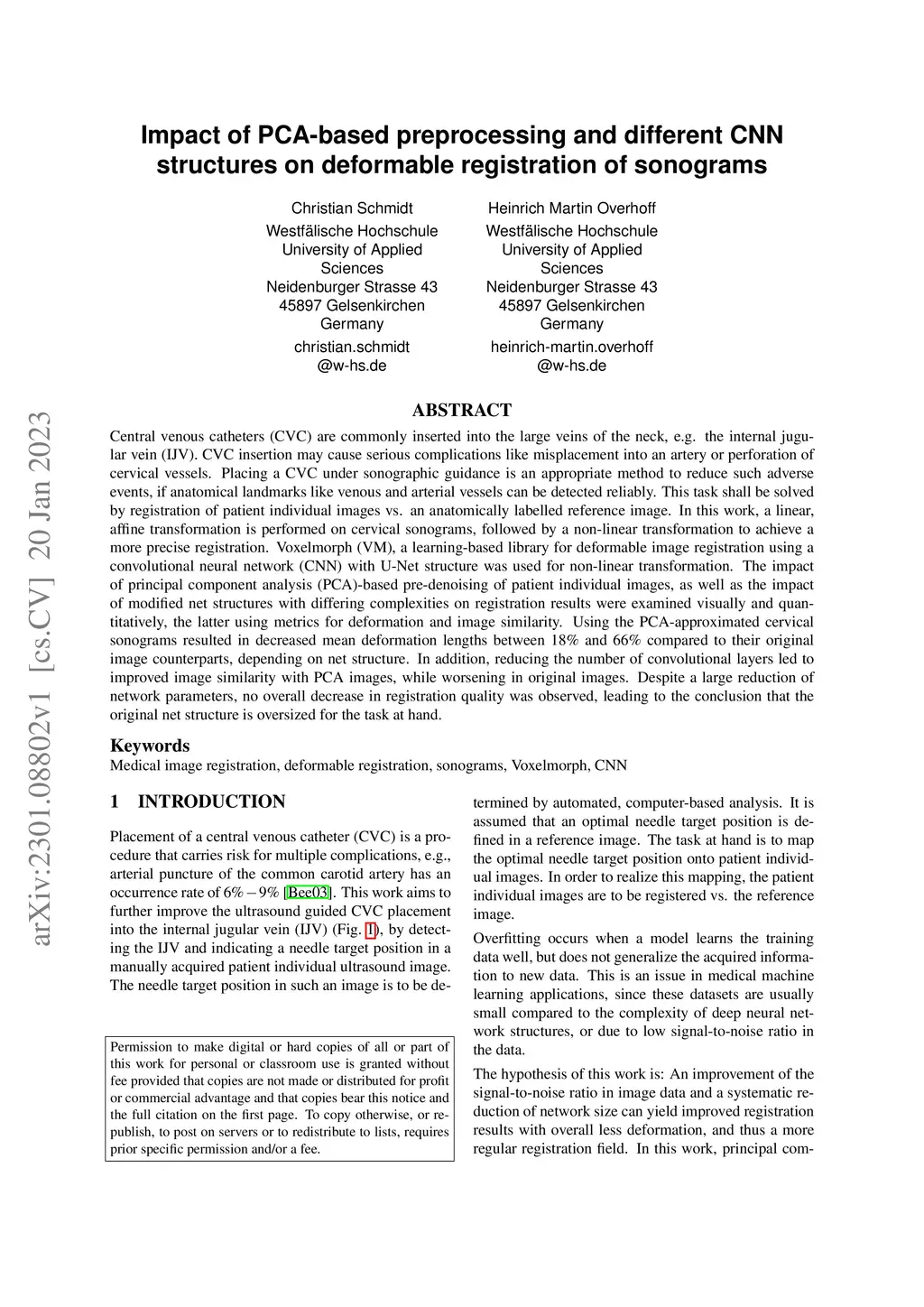 Central venous catheters (CVC) are commonly inserted into the large veins of the neck, e.g. the internal jugular vein (IJV). CVC insertion may cause serious complications like misplacement into an artery or perforation of cervical vessels. Placing a CVC under sonographic guidance is an appropriate method to reduce such adverse events, if anatomical landmarks like venous and arterial vessels can be detected reliably. This task shall be solved by registration of patient individual images vs. an anatomically labelled reference image. In this work, a linear, affine transformation is performed on cervical sonograms, followed by a non-linear transformation to achieve a more precise registration. Voxelmorph (VM), a learning-based library for deformable image registration using a convolutional neural network (CNN) with U-Net structure was used for non-linear transformation. The impact of principal component analysis (PCA)-based pre-denoising of patient individual images, as well as the impact of modified net structures with differing complexities on registration results were examined visually and quantitatively, the latter using metrics for deformation and image similarity. Using the PCA-approximated cervical sonograms resulted in decreased mean deformation lengths between 18% and 66% compared to their original image counterparts, depending on net structure. In addition, reducing the number of convolutional layers led to improved image similarity with PCA images, while worsening in original images. Despite a large reduction of network parameters, no overall decrease in registration quality was observed, leading to the conclusion that the original net structure is oversized for the task at hand.