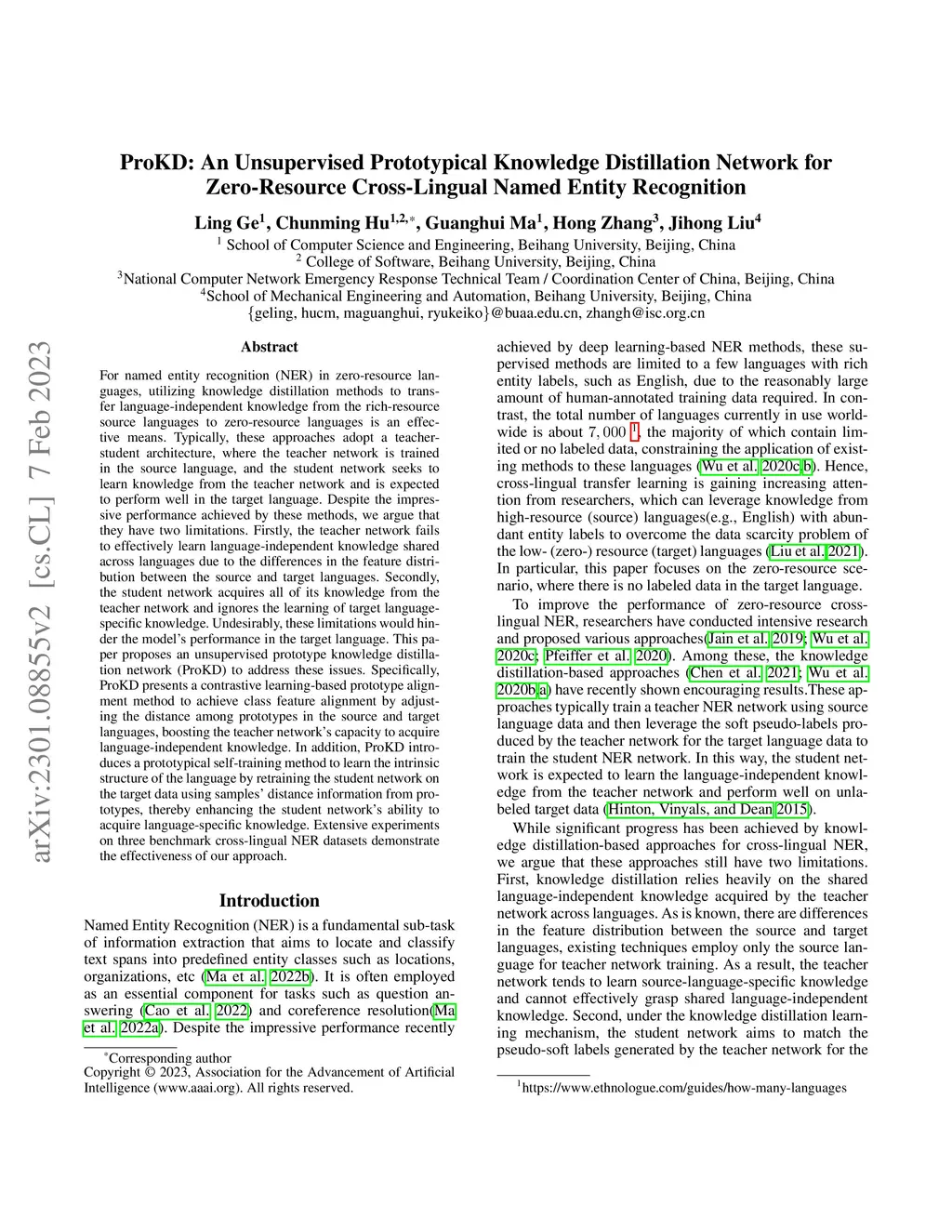 For named entity recognition (NER) in zero-resource languages, utilizing knowledge distillation methods to transfer language-independent knowledge from the rich-resource source languages to zero-resource languages is an effective means. Typically, these approaches adopt a teacher-student architecture, where the teacher network is trained in the source language, and the student network seeks to learn knowledge from the teacher network and is expected to perform well in the target language. Despite the impressive performance achieved by these methods, we argue that they have two limitations. Firstly, the teacher network fails to effectively learn language-independent knowledge shared across languages due to the differences in the feature distribution between the source and target languages. Secondly, the student network acquires all of its knowledge from the teacher network and ignores the learning of target language-specific knowledge. Undesirably, these limitations would hinder the model's performance in the target language. This paper proposes an unsupervised prototype knowledge distillation network (ProKD) to address these issues. Specifically, ProKD presents a contrastive learning-based prototype alignment method to achieve class feature alignment by adjusting the distance among prototypes in the source and target languages, boosting the teacher network's capacity to acquire language-independent knowledge. In addition, ProKD introduces a prototypical self-training method to learn the intrinsic structure of the language by retraining the student network on the target data using samples' distance information from prototypes, thereby enhancing the student network's ability to acquire language-specific knowledge. Extensive experiments on three benchmark cross-lingual NER datasets demonstrate the effectiveness of our approach.