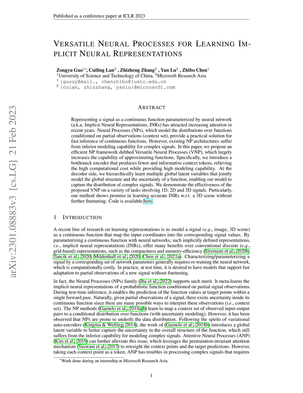Representing a signal as a continuous function parameterized by neural network (a.k.a. Implicit Neural Representations, INRs) has attracted increasing attention in recent years. Neural Processes (NPs), which model the distributions over functions conditioned on partial observations (context set), provide a practical solution for fast inference of continuous functions. However, existing NP architectures suffer from inferior modeling capability for complex signals. In this paper, we propose an efficient NP framework dubbed Versatile Neural Processes (VNP), which largely increases the capability of approximating functions. Specifically, we introduce a bottleneck encoder that produces fewer and informative context tokens, relieving the high computational cost while providing high modeling capability. At the decoder side, we hierarchically learn multiple global latent variables that jointly model the global structure and the uncertainty of a function, enabling our model to capture the distribution of complex signals. We demonstrate the effectiveness of the proposed VNP on a variety of tasks involving 1D, 2D and 3D signals. Particularly, our method shows promise in learning accurate INRs w.r.t. a 3D scene without further finetuning. Code is available at https://github.com/ZongyuGuo/Versatile-NP .