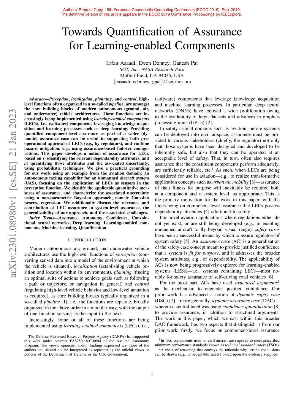Perception, localization, planning, and control, high-level functions often organized in a so-called pipeline, are amongst the core building blocks of modern autonomous (ground, air, and underwater) vehicle architectures. These functions are increasingly being implemented using learning-enabled components (LECs), i.e., (software) components leveraging knowledge acquisition and learning processes such as deep learning. Providing quantified component-level assurance as part of a wider (dynamic) assurance case can be useful in supporting both pre-operational approval of LECs (e.g., by regulators), and runtime hazard mitigation, e.g., using assurance-based failover configurations. This paper develops a notion of assurance for LECs based on i) identifying the relevant dependability attributes, and ii) quantifying those attributes and the associated uncertainty, using probabilistic techniques. We give a practical grounding for our work using an example from the aviation domain: an autonomous taxiing capability for an unmanned aircraft system (UAS), focusing on the application of LECs as sensors in the perception function. We identify the applicable quantitative measures of assurance, and characterize the associated uncertainty using a non-parametric Bayesian approach, namely Gaussian process regression. We additionally discuss the relevance and contribution of LEC assurance to system-level assurance, the generalizability of our approach, and the associated challenges.