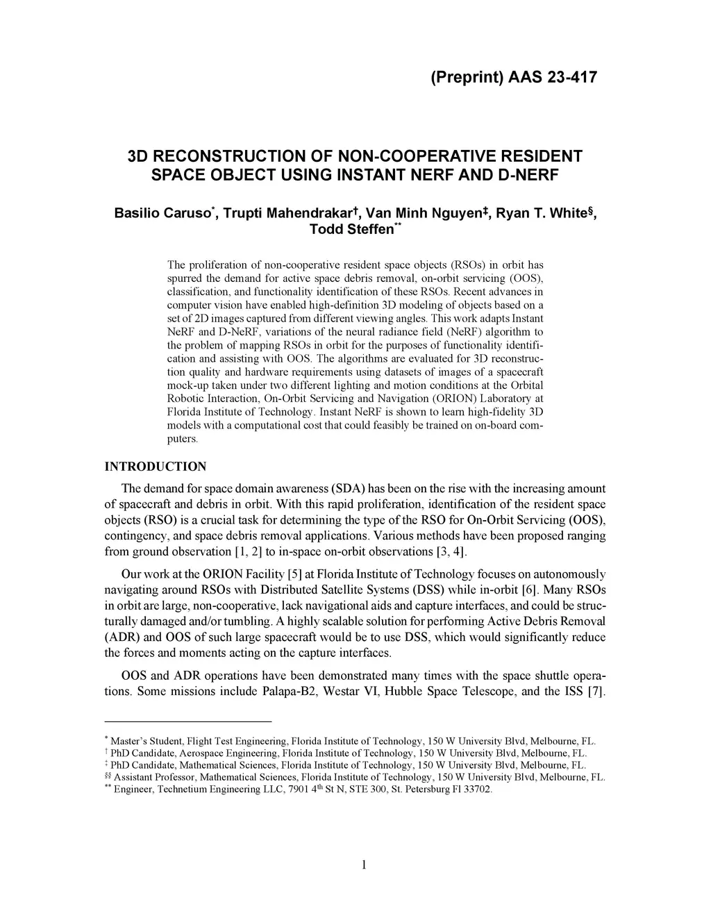 The proliferation of non-cooperative resident space objects (RSOs) in orbit has spurred the demand for active space debris removal, on-orbit servicing (OOS), classification, and functionality identification of these RSOs. Recent advances in computer vision have enabled high-definition 3D modeling of objects based on a set of 2D images captured from different viewing angles. This work adapts Instant NeRF and D-NeRF, variations of the neural radiance field (NeRF) algorithm to the problem of mapping RSOs in orbit for the purposes of functionality identification and assisting with OOS. The algorithms are evaluated for 3D reconstruction quality and hardware requirements using datasets of images of a spacecraft mock-up taken under two different lighting and motion conditions at the Orbital Robotic Interaction, On-Orbit Servicing and Navigation (ORION) Laboratory at Florida Institute of Technology. Instant NeRF is shown to learn high-fidelity 3D models with a computational cost that could feasibly be trained on on-board computers.