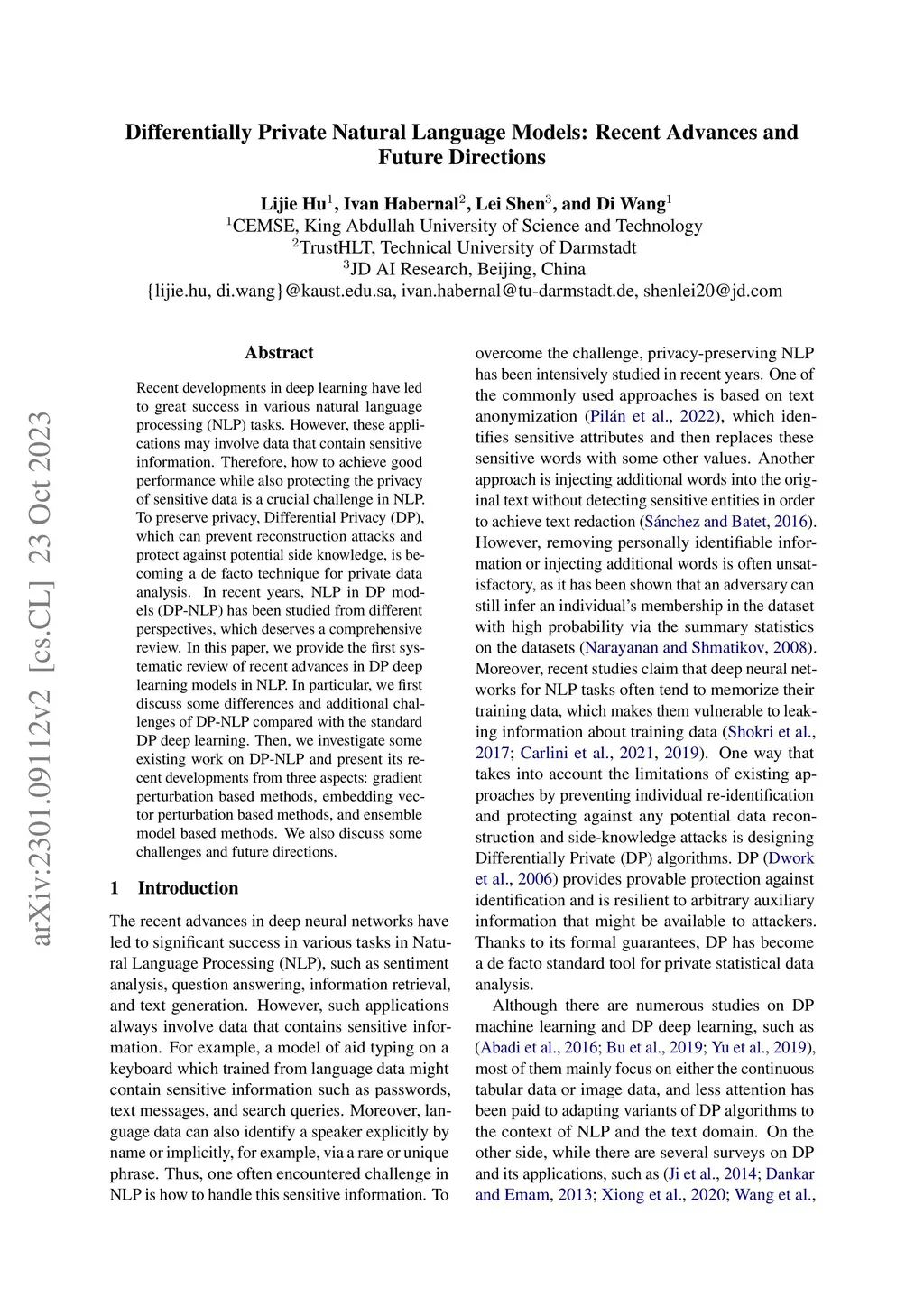 Recent developments in deep learning have led to great success in various natural language processing (NLP) tasks. However, these applications may involve data that contain sensitive information. Therefore, how to achieve good performance while also protecting the privacy of sensitive data is a crucial challenge in NLP. To preserve privacy, Differential Privacy (DP), which can prevent reconstruction attacks and protect against potential side knowledge, is becoming a de facto technique for private data analysis. In recent years, NLP in DP models (DP-NLP) has been studied from different perspectives, which deserves a comprehensive review. In this paper, we provide the first systematic review of recent advances in DP deep learning models in NLP. In particular, we first discuss some differences and additional challenges of DP-NLP compared with the standard DP deep learning. Then, we investigate some existing work on DP-NLP and present its recent developments from three aspects: gradient perturbation based methods, embedding vector perturbation based methods, and ensemble model based methods. We also discuss some challenges and future directions.
