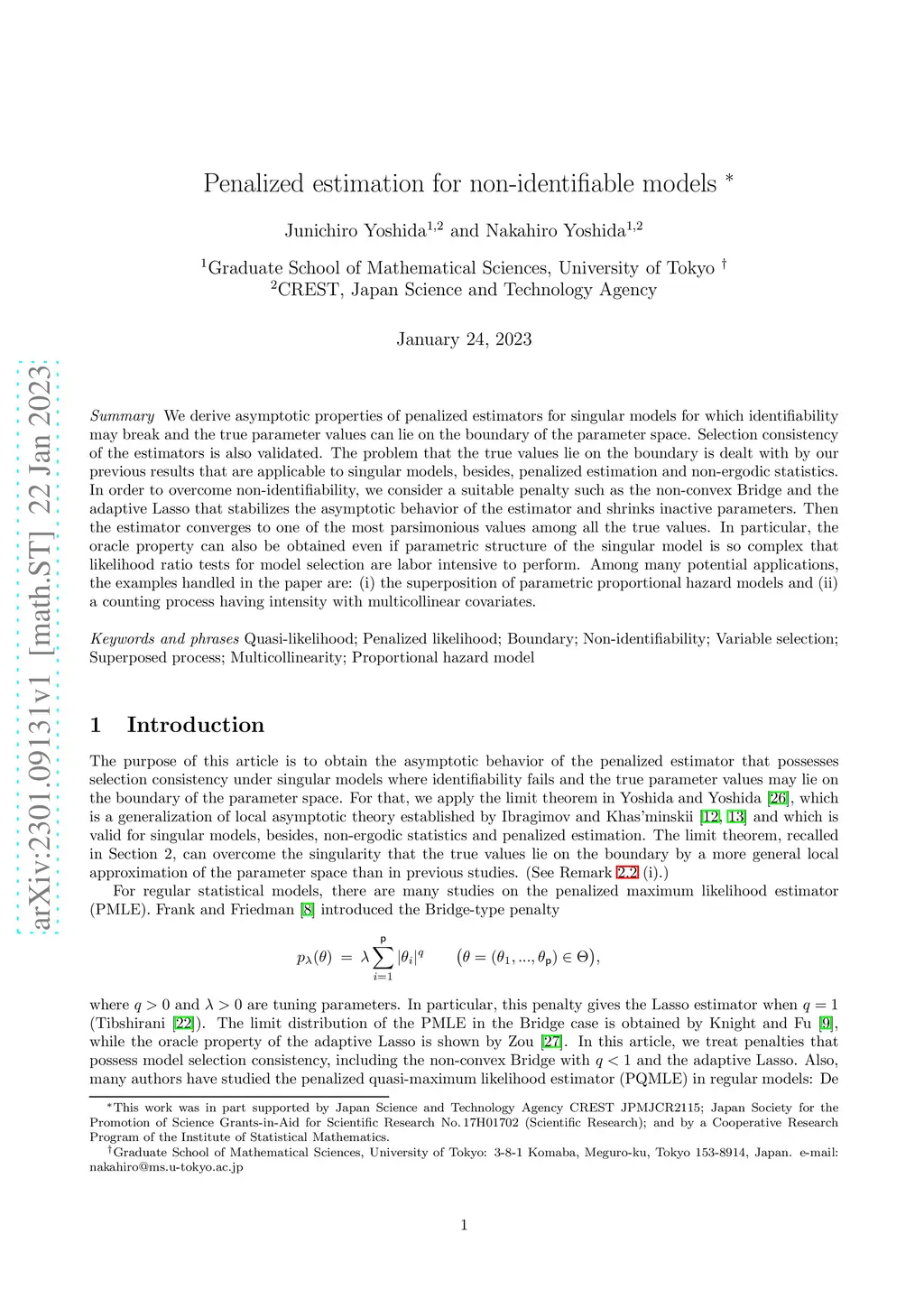 We derive asymptotic properties of penalized estimators for singular models for which identifiability may break and the true parameter values can lie on the boundary of the parameter space. Selection consistency of the estimators is also validated. The problem that the true values lie on the boundary is dealt with by our previous results that are applicable to singular models, besides, penalized estimation and non-ergodic statistics. In order to overcome non-identifiability, we consider a suitable penalty such as the non-convex Bridge and the adaptive Lasso that stabilizes the asymptotic behavior of the estimator and shrinks inactive parameters. Then the estimator converges to one of the most parsimonious values among all the true values. In particular, the oracle property can also be obtained even if parametric structure of the singular model is so complex that likelihood ratio tests for model selection are labor intensive to perform. Among many potential applications, the examples handled in the paper are: (i) the superposition of parametric proportional hazard models and (ii) a counting process having intensity with multicollinear covariates.