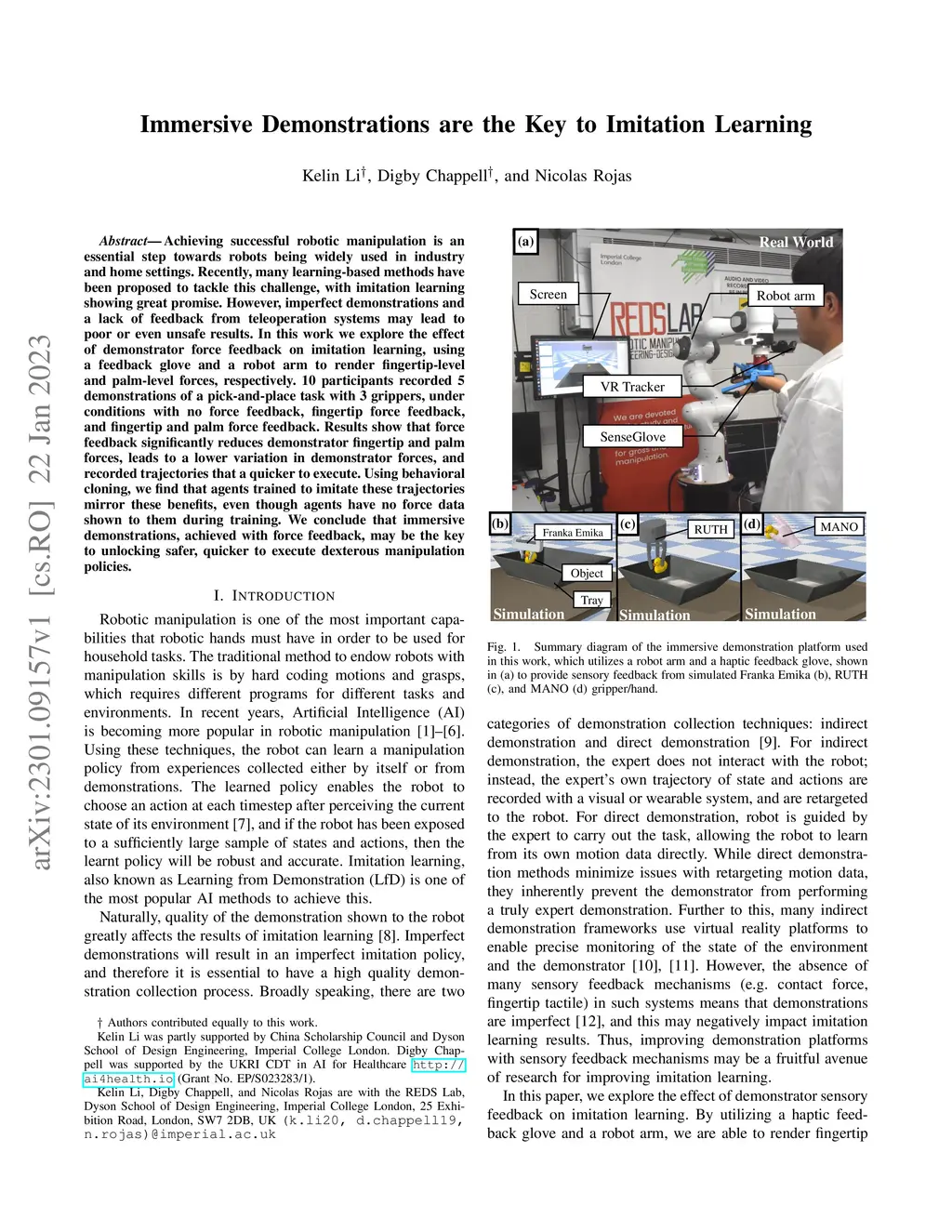 Achieving successful robotic manipulation is an essential step towards robots being widely used in industry and home settings. Recently, many learning-based methods have been proposed to tackle this challenge, with imitation learning showing great promise. However, imperfect demonstrations and a lack of feedback from teleoperation systems may lead to poor or even unsafe results. In this work we explore the effect of demonstrator force feedback on imitation learning, using a feedback glove and a robot arm to render fingertip-level and palm-level forces, respectively. 10 participants recorded 5 demonstrations of a pick-and-place task with 3 grippers, under conditions with no force feedback, fingertip force feedback, and fingertip and palm force feedback. Results show that force feedback significantly reduces demonstrator fingertip and palm forces, leads to a lower variation in demonstrator forces, and recorded trajectories that a quicker to execute. Using behavioral cloning, we find that agents trained to imitate these trajectories mirror these benefits, even though agents have no force data shown to them during training. We conclude that immersive demonstrations, achieved with force feedback, may be the key to unlocking safer, quicker to execute dexterous manipulation policies.