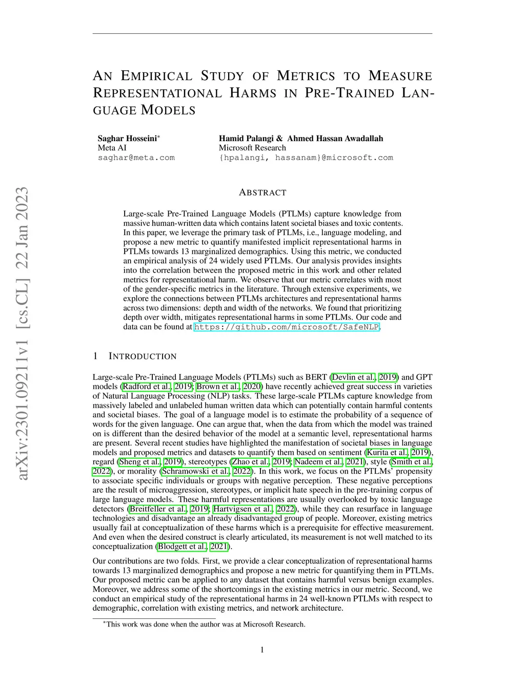 Large-scale Pre-Trained Language Models (PTLMs) capture knowledge from massive human-written data which contains latent societal biases and toxic contents. In this paper, we leverage the primary task of PTLMs, i.e., language modeling, and propose a new metric to quantify manifested implicit representational harms in PTLMs towards 13 marginalized demographics. Using this metric, we conducted an empirical analysis of 24 widely used PTLMs. Our analysis provides insights into the correlation between the proposed metric in this work and other related metrics for representational harm. We observe that our metric correlates with most of the gender-specific metrics in the literature. Through extensive experiments, we explore the connections between PTLMs architectures and representational harms across two dimensions: depth and width of the networks. We found that prioritizing depth over width, mitigates representational harms in some PTLMs. Our code and data can be found at https://github.com/microsoft/SafeNLP.